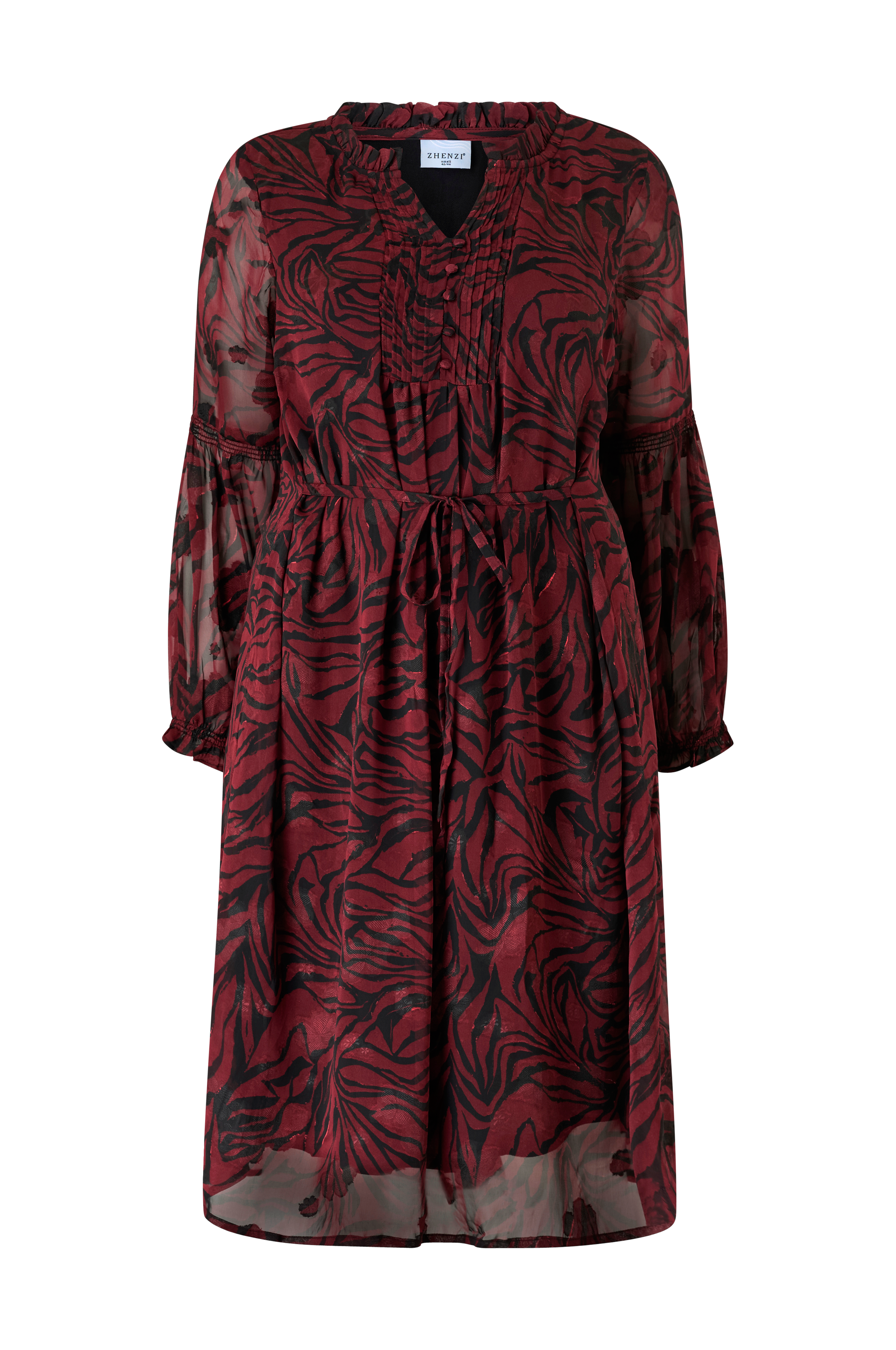 • Klänning i mönstrad chiffong • Rund halsringning med sprund och volangkant • Dekorativa, klädda knappar upptill fram • Långa ärmar med smockdetalj och elastiska ärmslut • Knytband i midjan • Mjukt foder i trikå • Plusstorlekar • Längd: 115 cm i storlek S