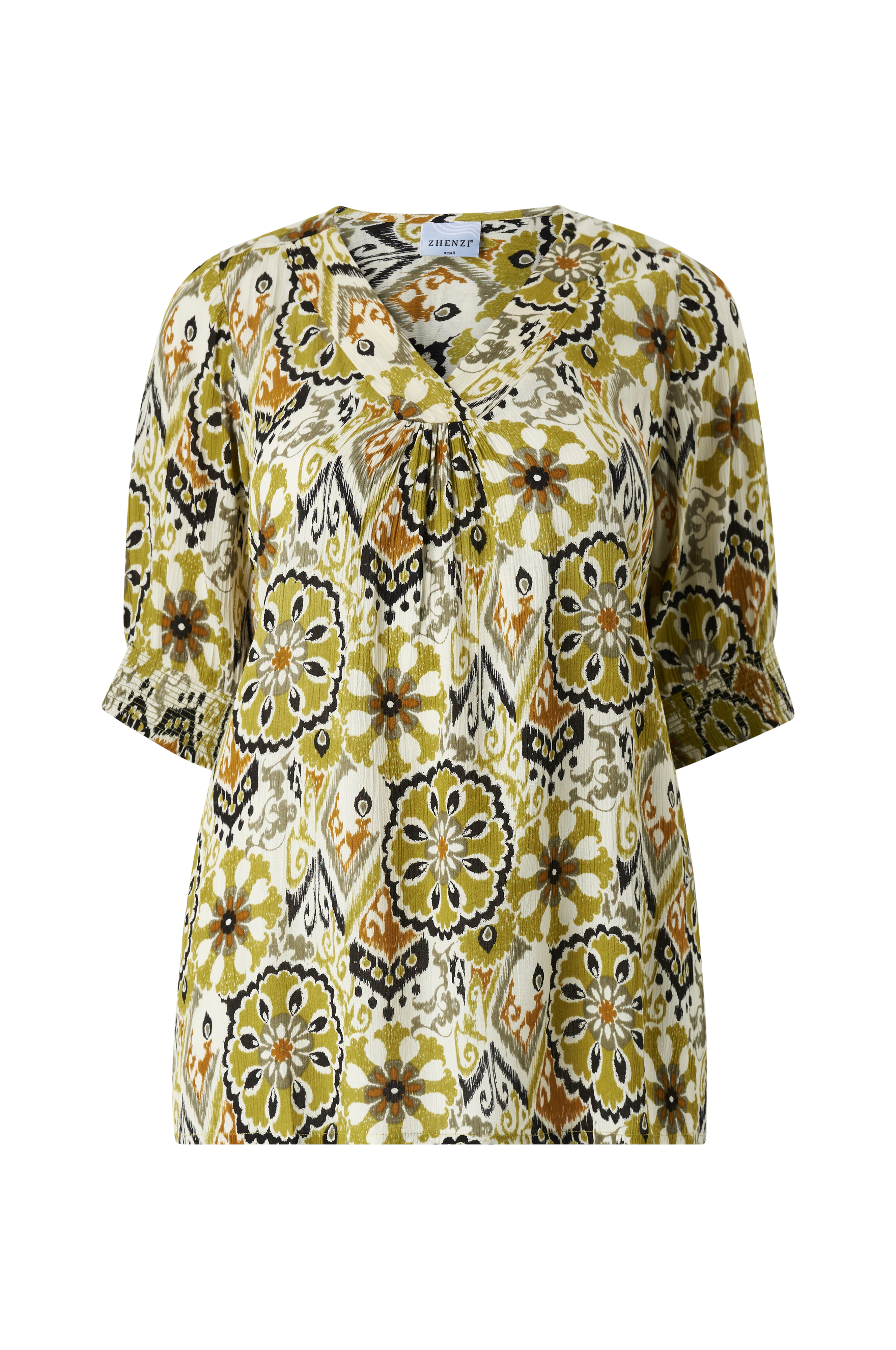 • Plusstorlekar• Utsvängd modell i kräppkvalitet• V-ringad hals med rynk på bröstet• Vid, halvlång ärm med resårsömmar nedtill