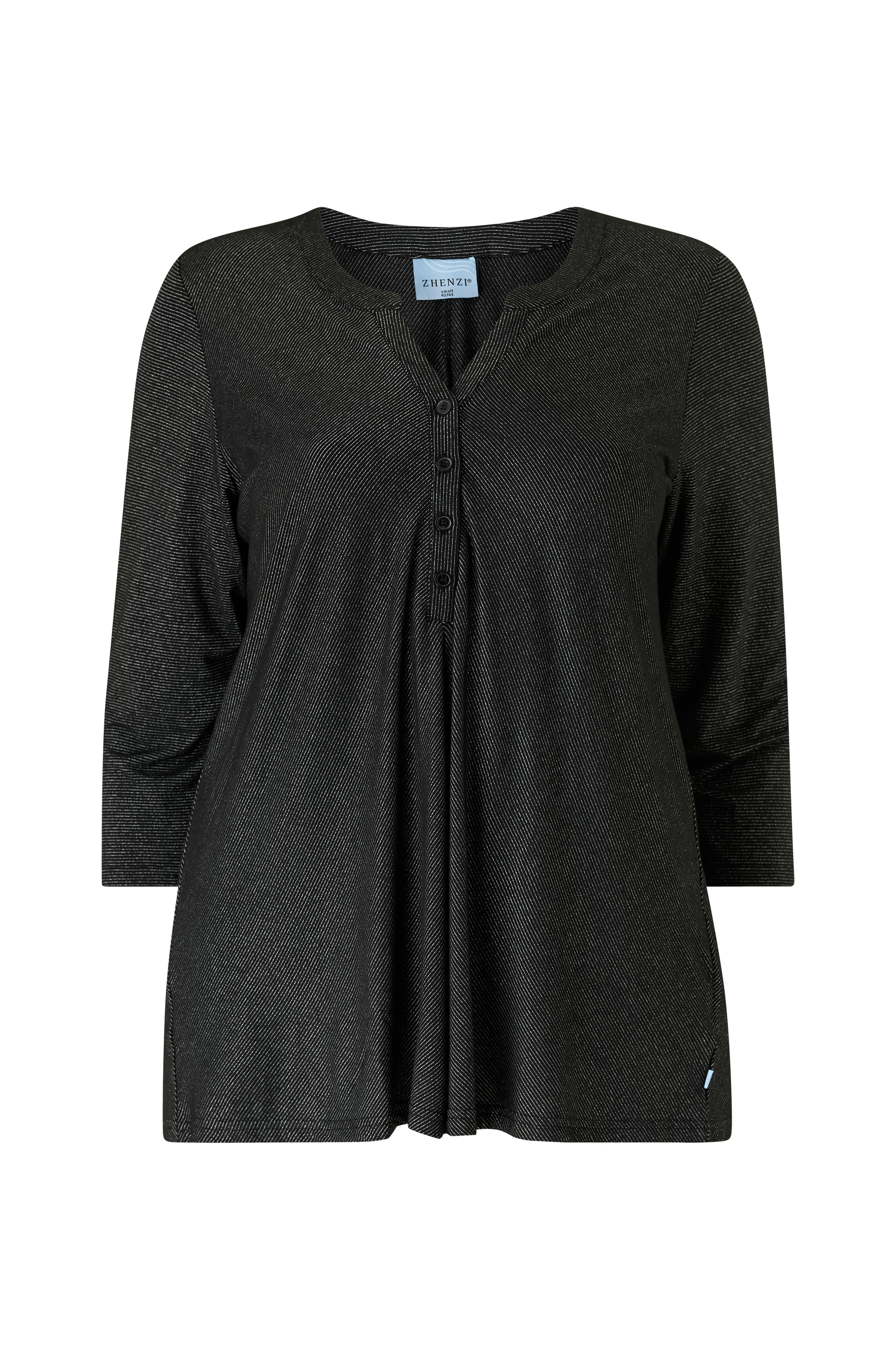 • Glittrig topp i viskosmix• V-ringning• 3/4-långa ärmar• Kort knappslå• Plusstorlekar