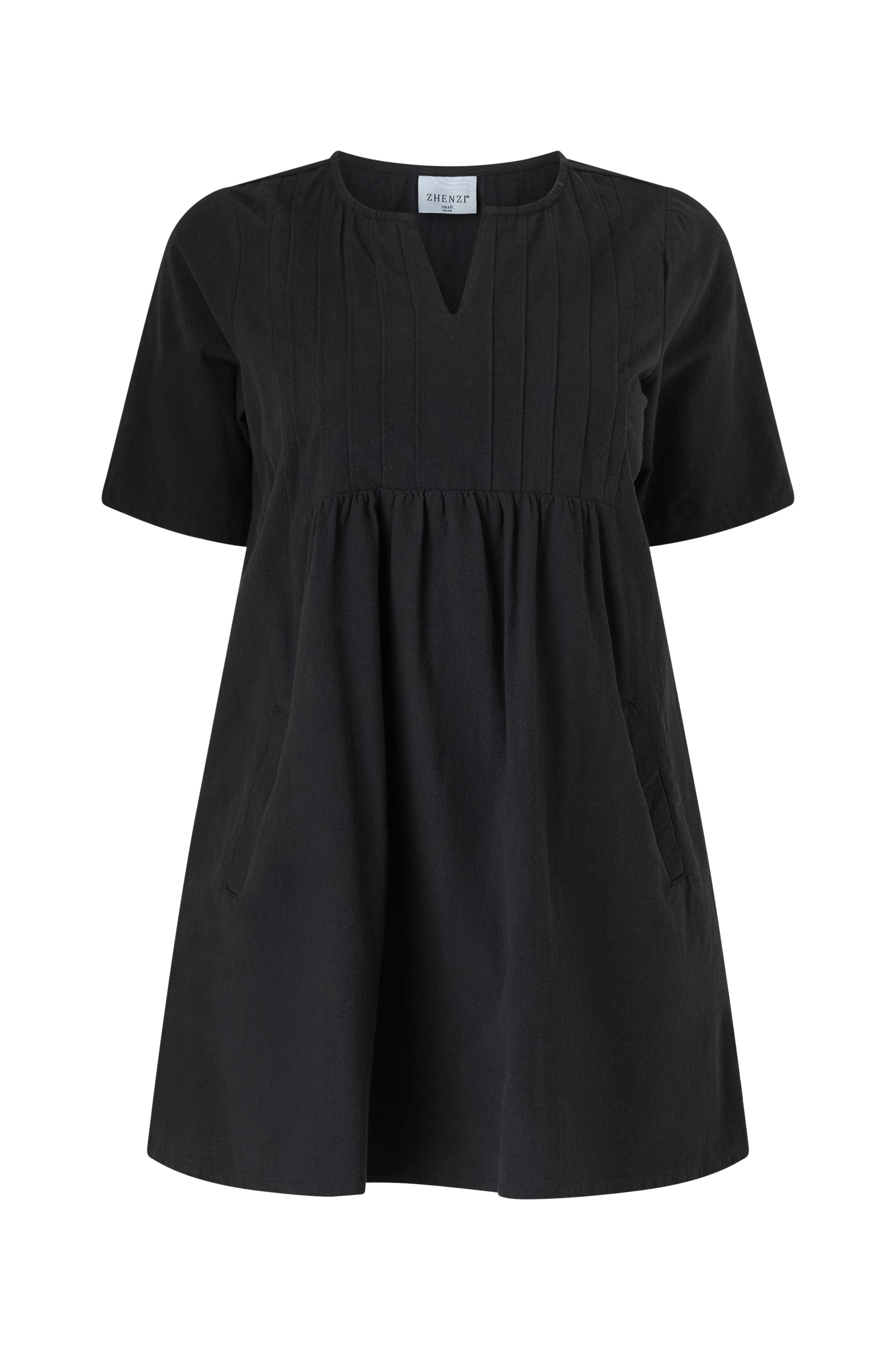 • Tunika med sidfickor• Rund hals• Sprund framtill• Korta ärmar• Sydda veck upptill fram• Veckad detalj i midjan• Plusstorlekar• Längd: 86 cm i storlek S