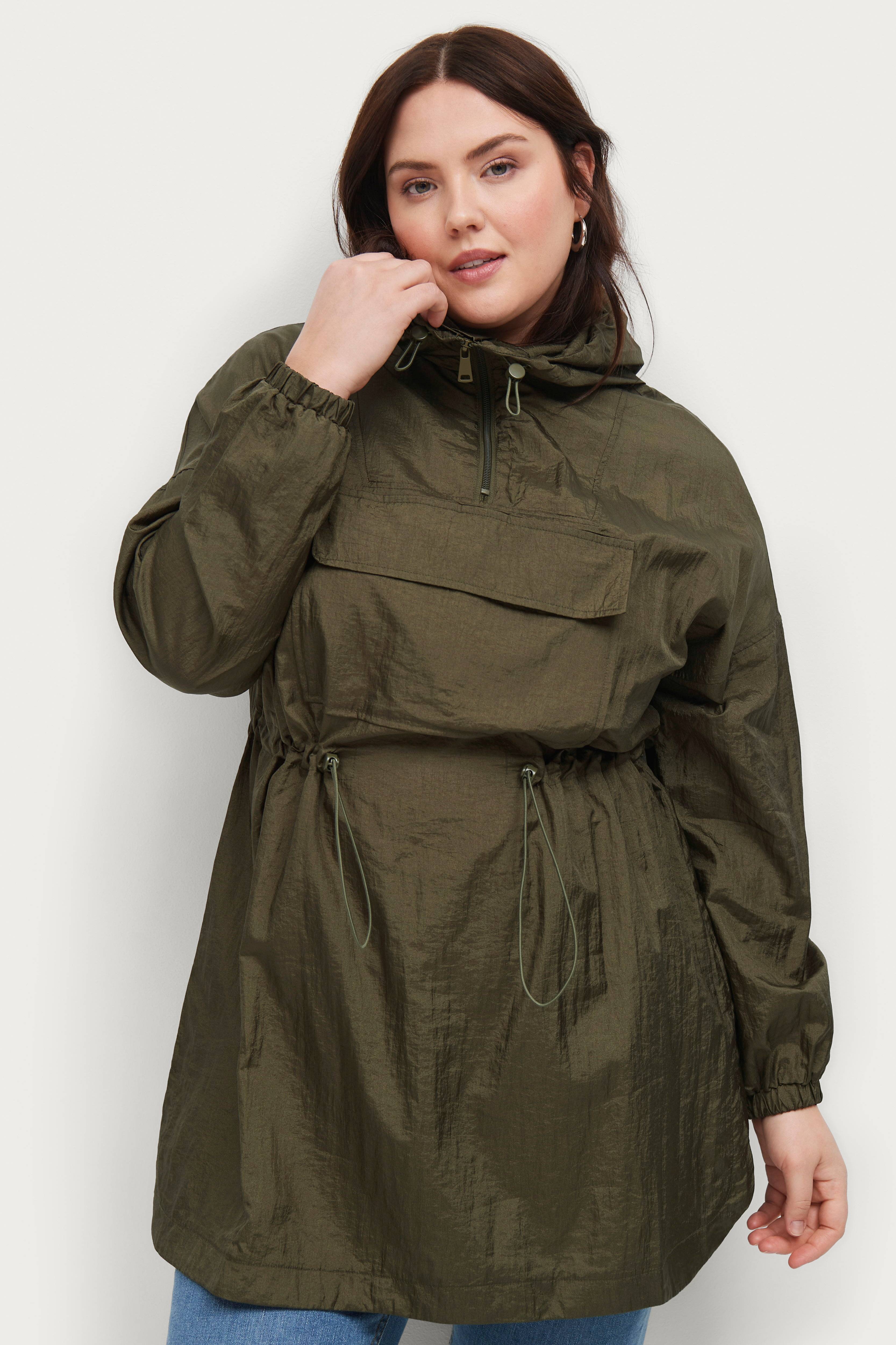 • Lång modell • Lätt glansigt material • Fast huva med dragsko • Kort dragkedja • Ficka mitt fram • Dragsko i midjan • Resår i ärmsluten • Sprund nedtill i sidorna • Plusstorlekar • Längd: 90 cm i storlek S