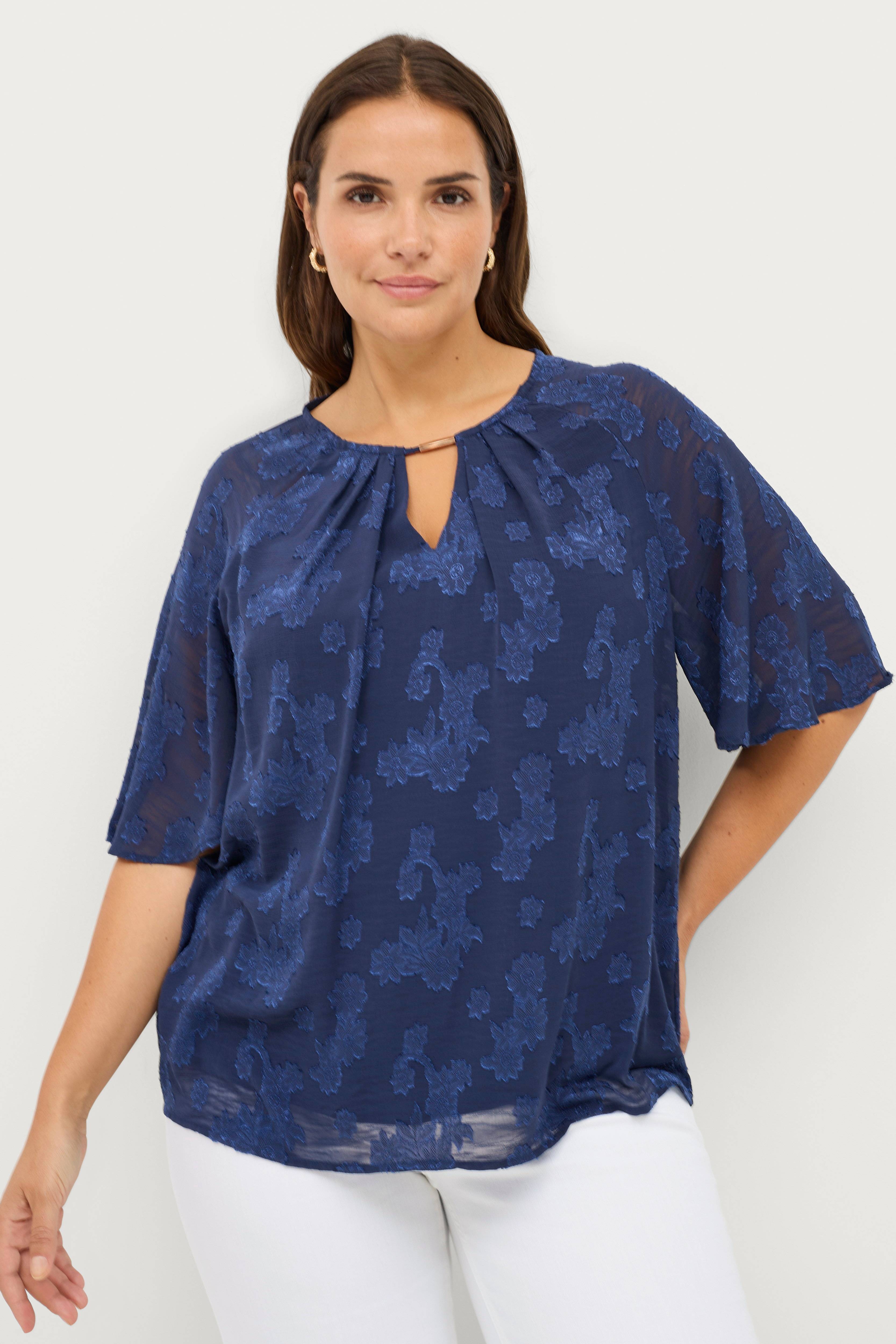 • Blus i chiffong med jacquardmönster• Vida, halvlånga ärmar• Veckad halsringning med öppning och guldfärgad detalj fram• Sprund med knapp i nacken• Trikåfoder• Plusstorlekar