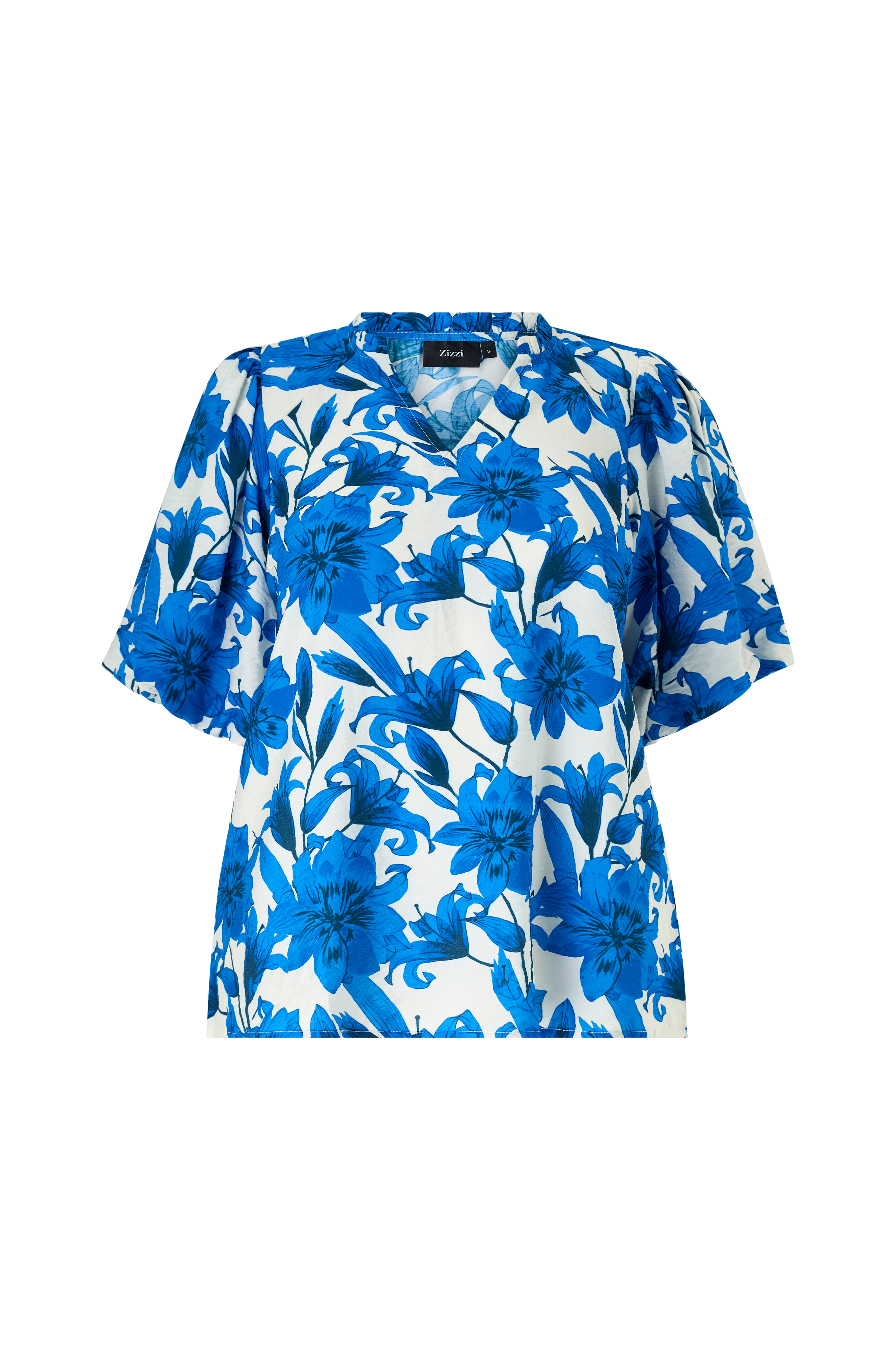 • Mönstrad blus i viskosmix• V-ringning• Dekorativ volangkant• Korta ballongärmar• Plusstorlekar