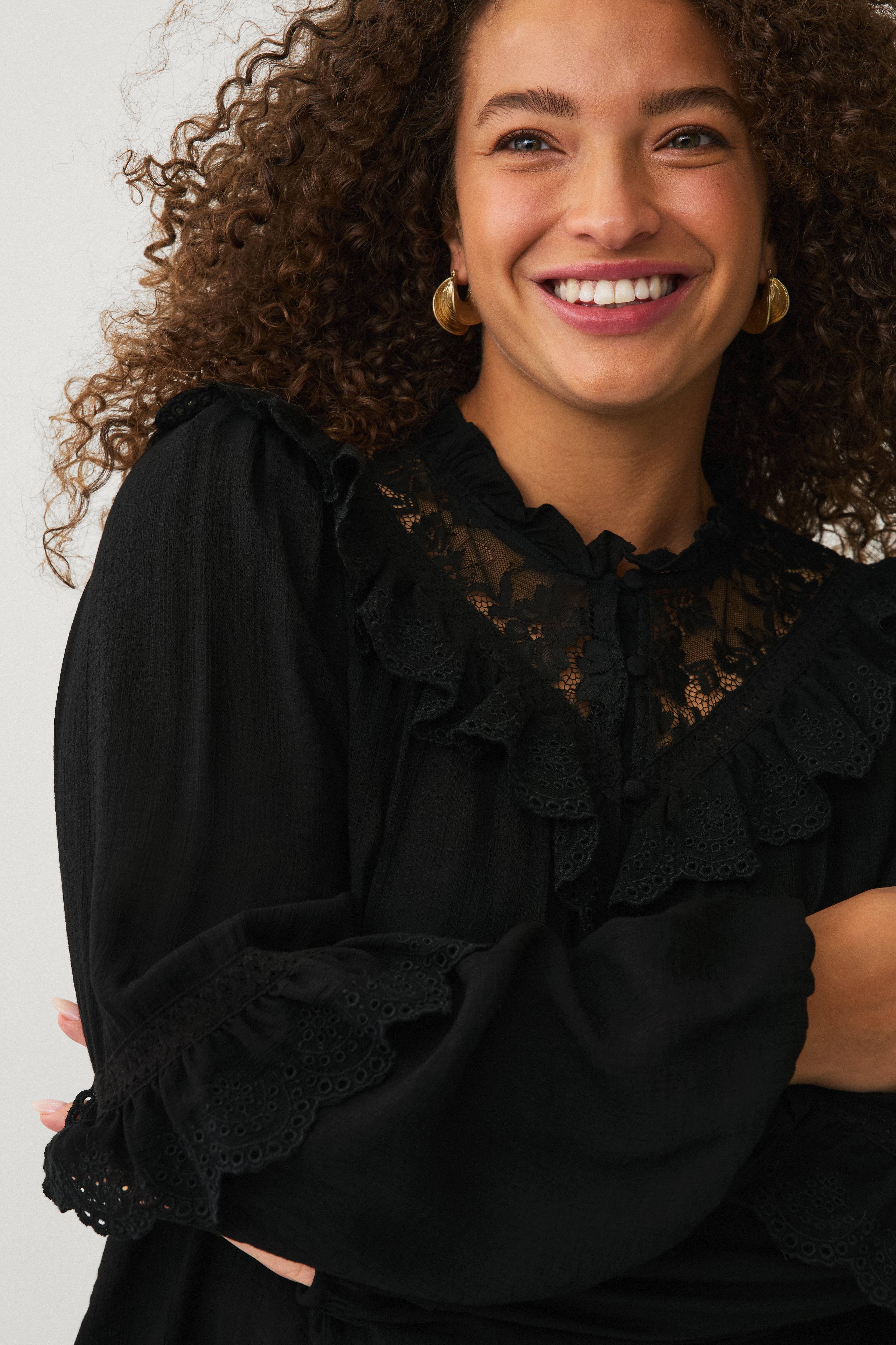 • Blus med avslappnad passform i krinklat material • Rund halsringning med volangkrage och spets • Volang med hålbroderi upptill fram, över axlarna och bak • Klädda knappar hela vägen fram • Långa puffärmar med resår i ärmsluten • Volang med hålbroderier runt ärmarna • Plusstorlekar