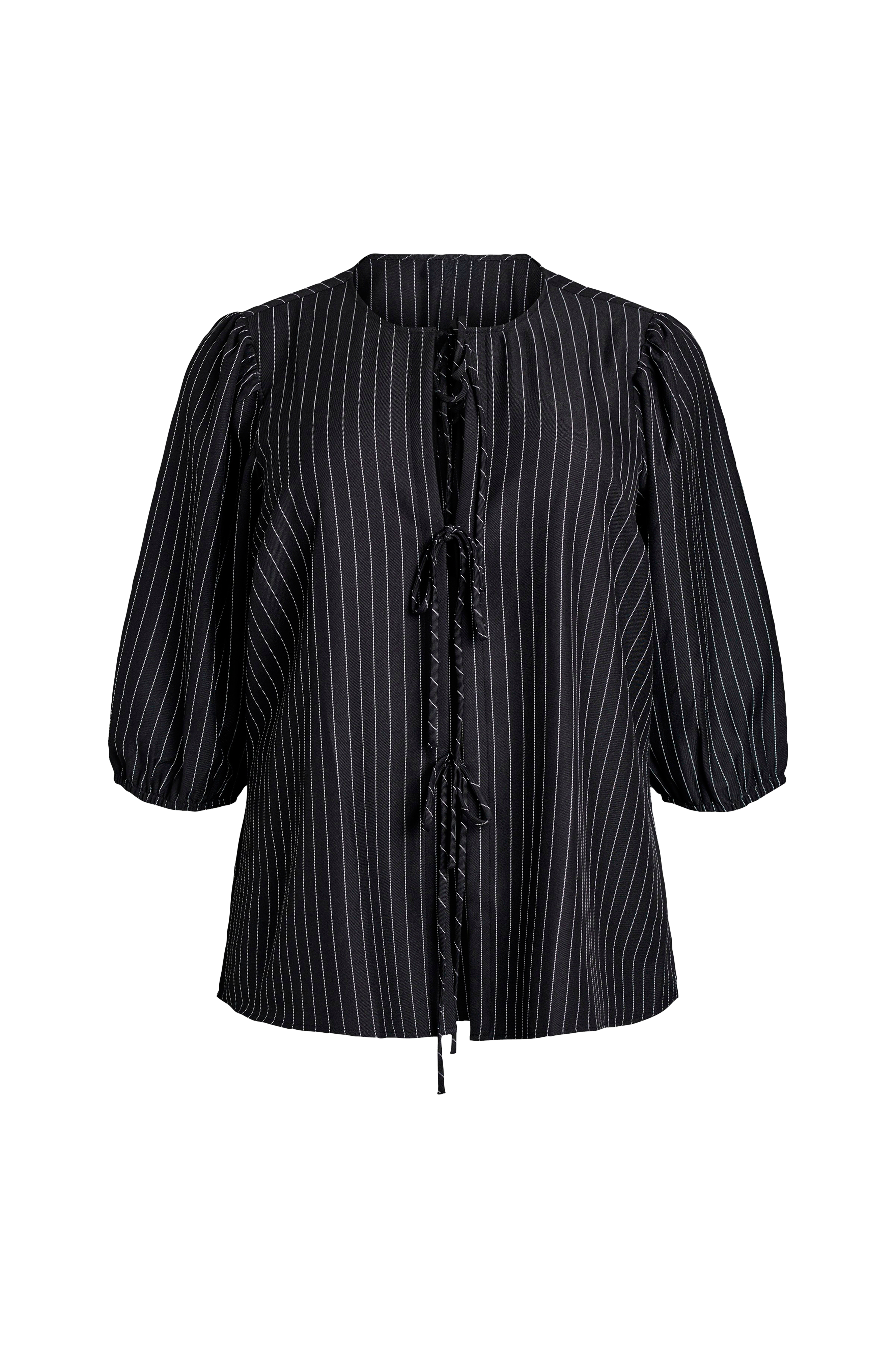 • Kritstrecksrandig blus med rund halsringning• Knytstängning fram• Halvlånga puffärmar med elastiska ärmslut• Plusstorlekar