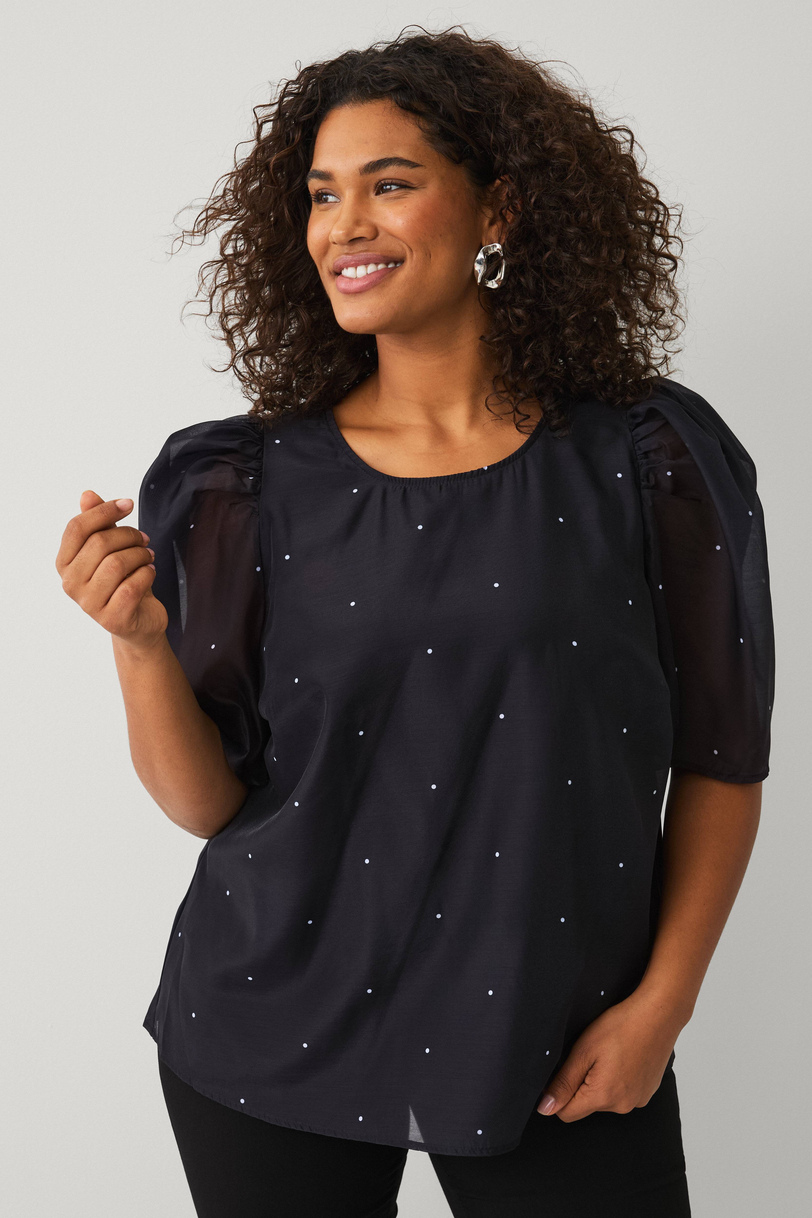 • Blus i organza• Rund halsringning• Sprund med knapp i nacken• Korta, transparenta puffärmar• Textilfoder• Plusstorlekar