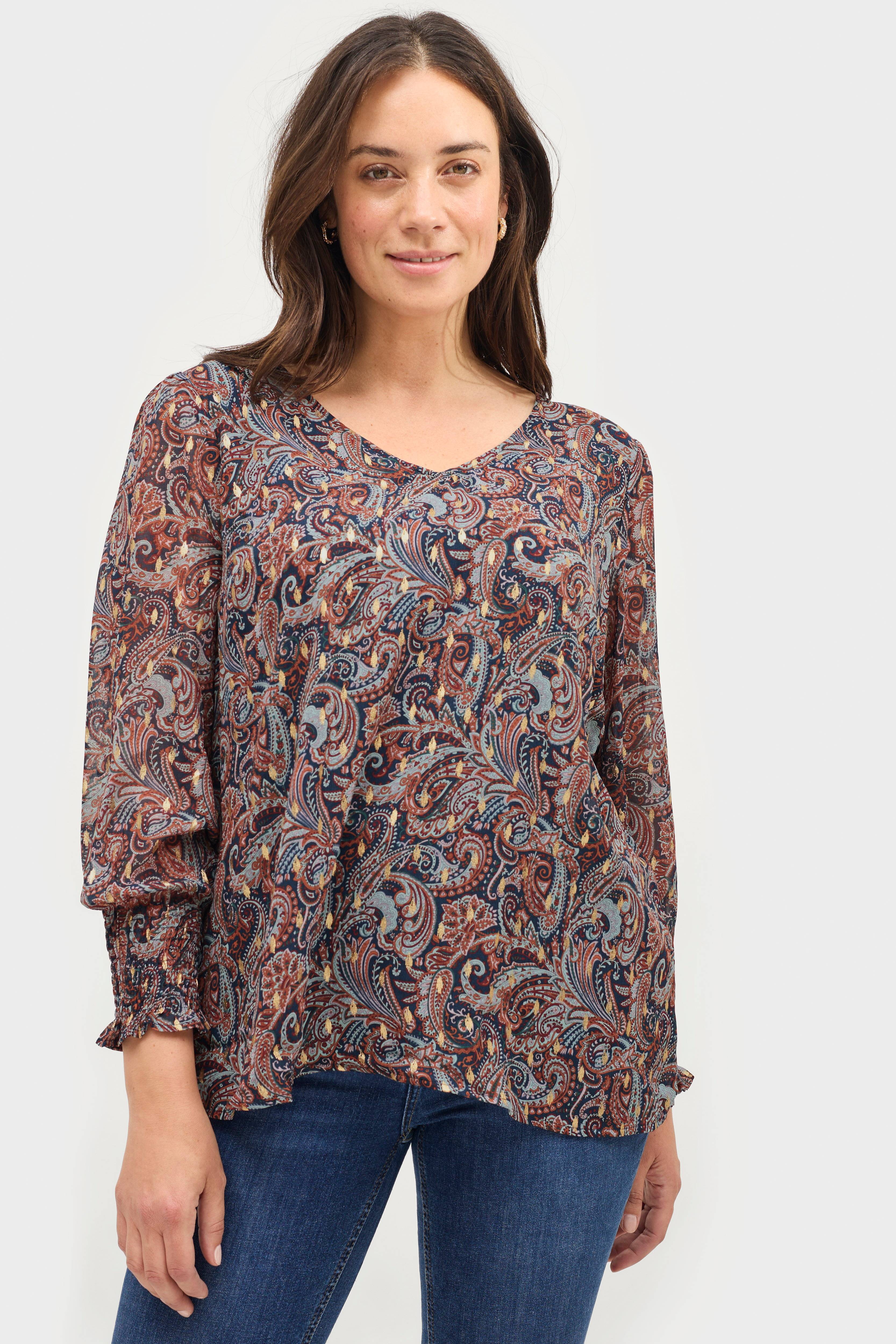 • Fodrad blus• Ofodrade ärmar• V-ringad hals• Långa ärmar med smock i ärmsluten