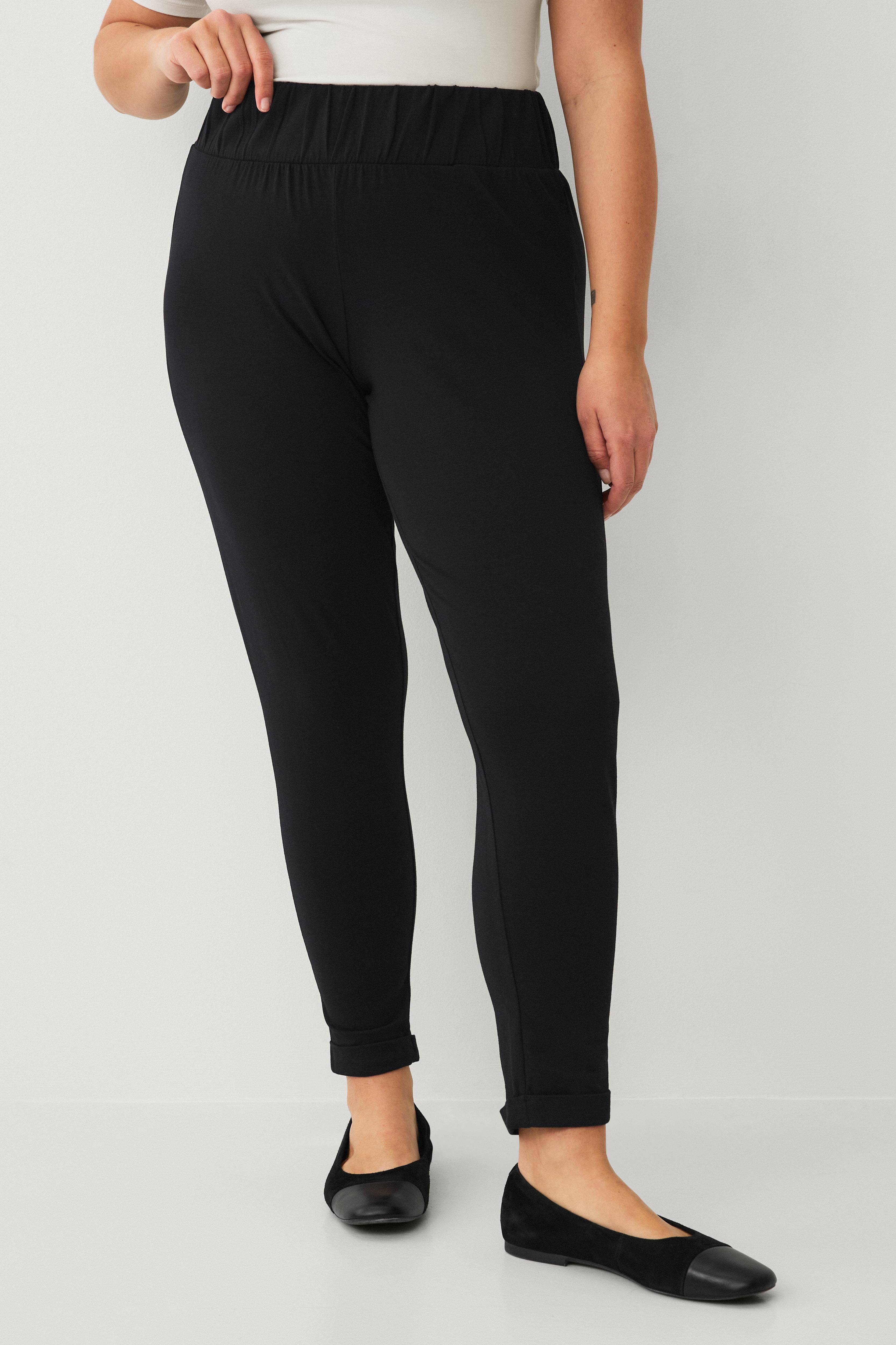 • Plusstorlekar• Mjuk modell i trikå• Bred linning med infälld resår• Vida ben med avsmalnande benslut och fäst uppvik• Beninnerlängd: 72 cm i storlek S