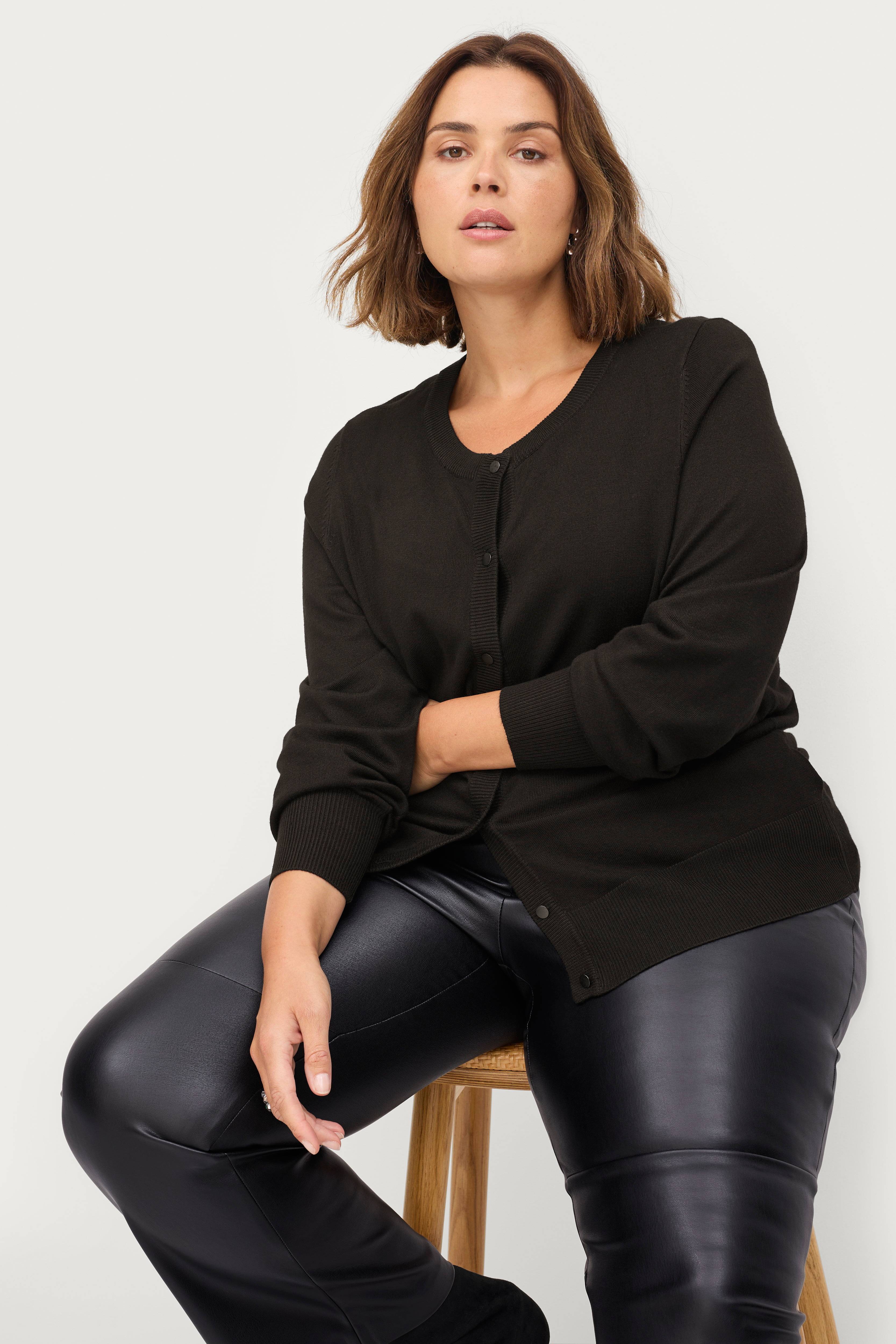 • Plusstorlekar• Rak modell• Rund hals• Lång ärm med ribbmudd i ärmsluten• Knappar fram med ribbstickad kant• Ribbstickning i nederkanten