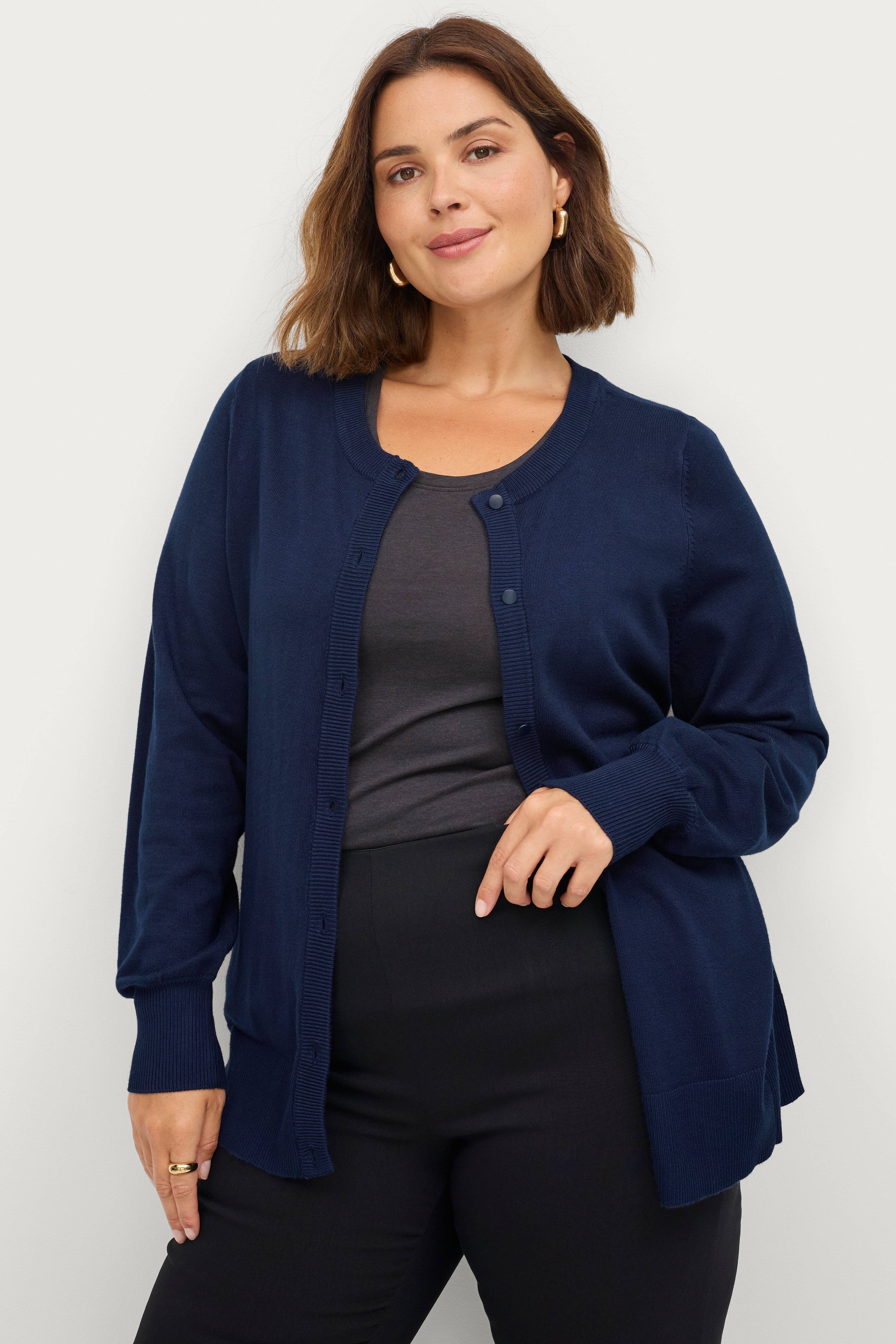 • Plusstorlekar• Rak modell• Rund hals• Lång ärm med ribbmudd i ärmsluten• Knappar fram med ribbstickad kant• Ribbstickning i nederkanten