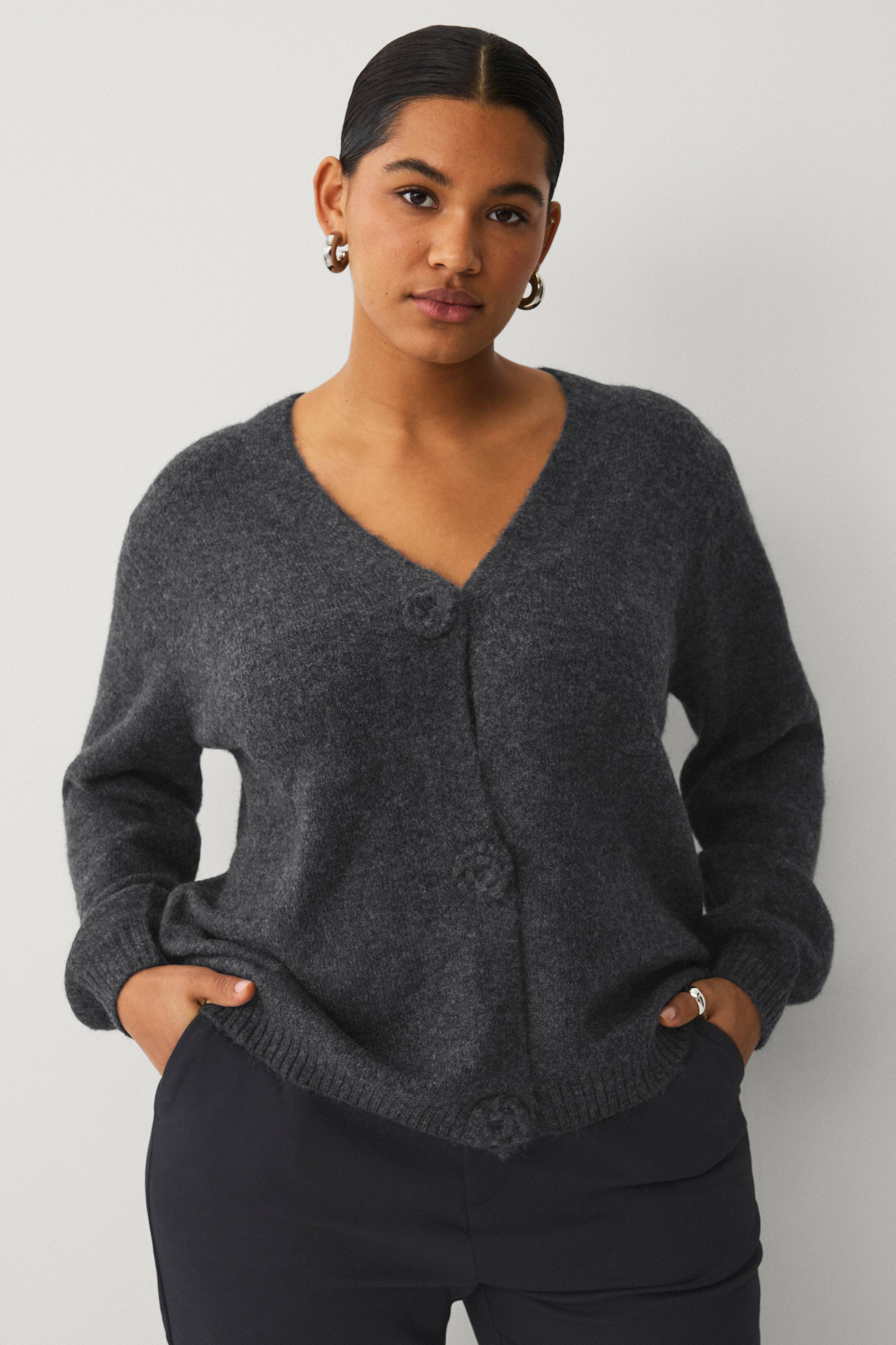• Stickad cardigan med dolda tryckknappar• V-ringning• Ribbstickning i ärmsluten och nedtill• Plusstorlekar