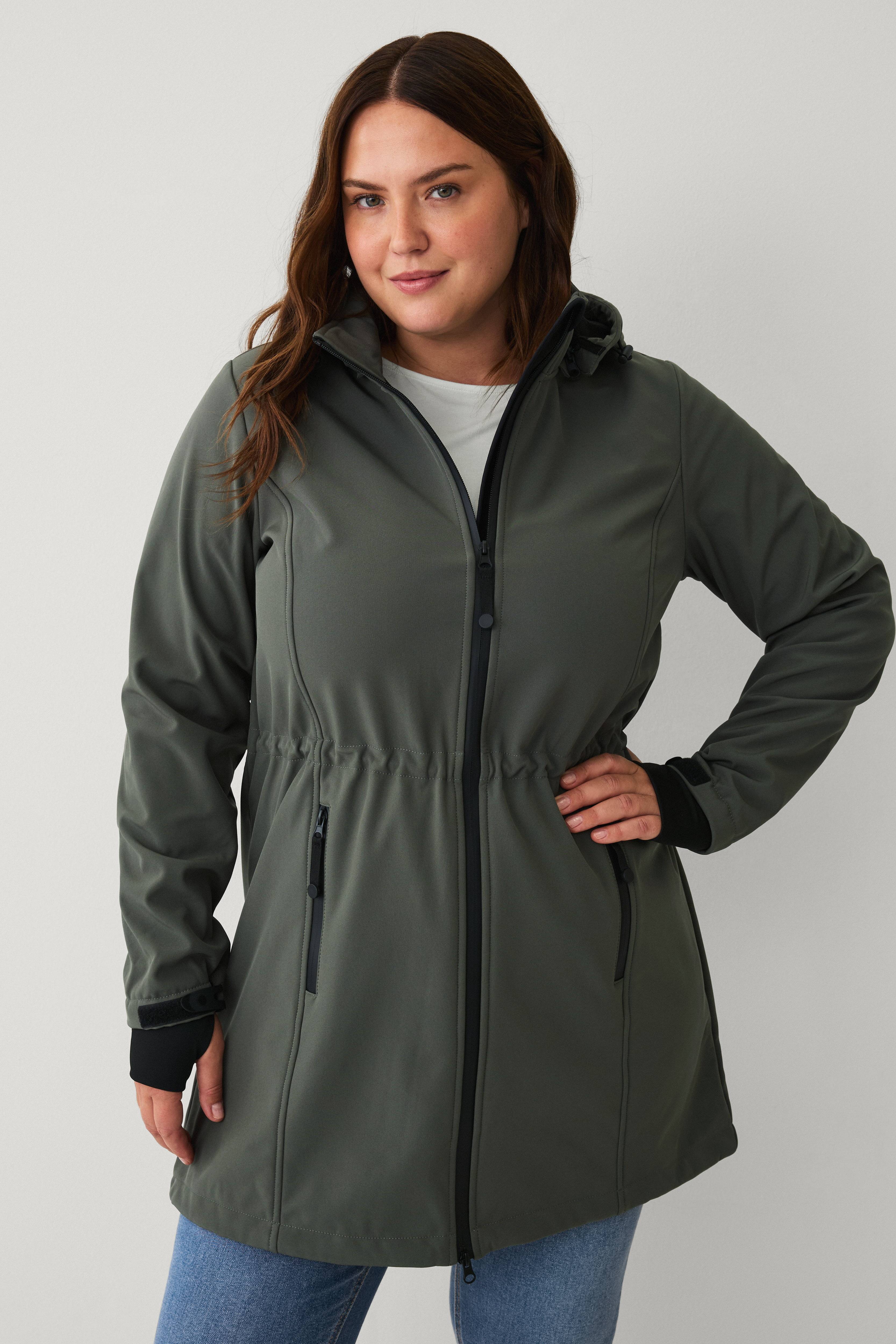 • Vattenavvisande softshelljacka med avtagbar, fleecefodrad huva • Tvåvägsdragkedja • Långa ärmar med kardborrerem i ärmsluten • Dragkedjefickor fram • Invändig dragsko med stopper i midjan och vid fållen • Fleecefoder • Plusstorlekar • Längd: 94 cm i storlek S • Vattenpelare: 10 000 mm