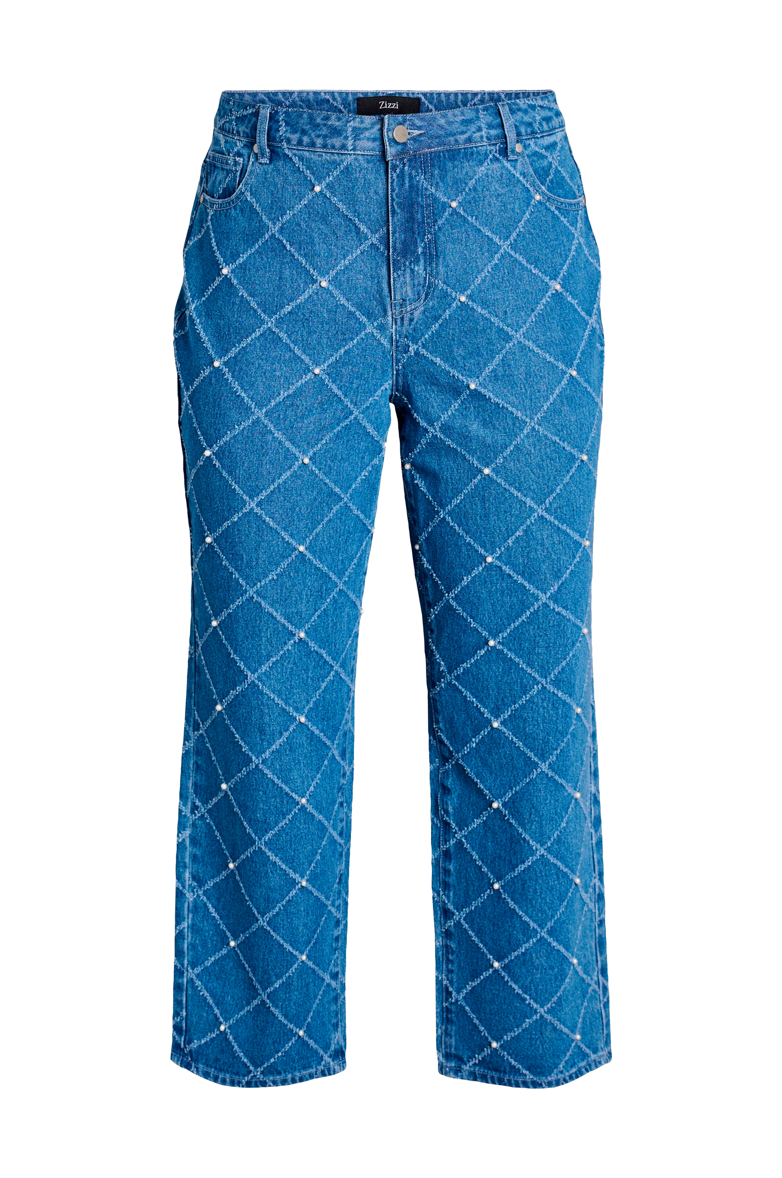 • Högmidjade jeans med raka ben• Diamantformat mönster med slitningar och dekorativa pärlor• Femficksmodell• Dragkedjegylf• Plusstorlekar• Beninnerlängd: 81 cm i storlek 42