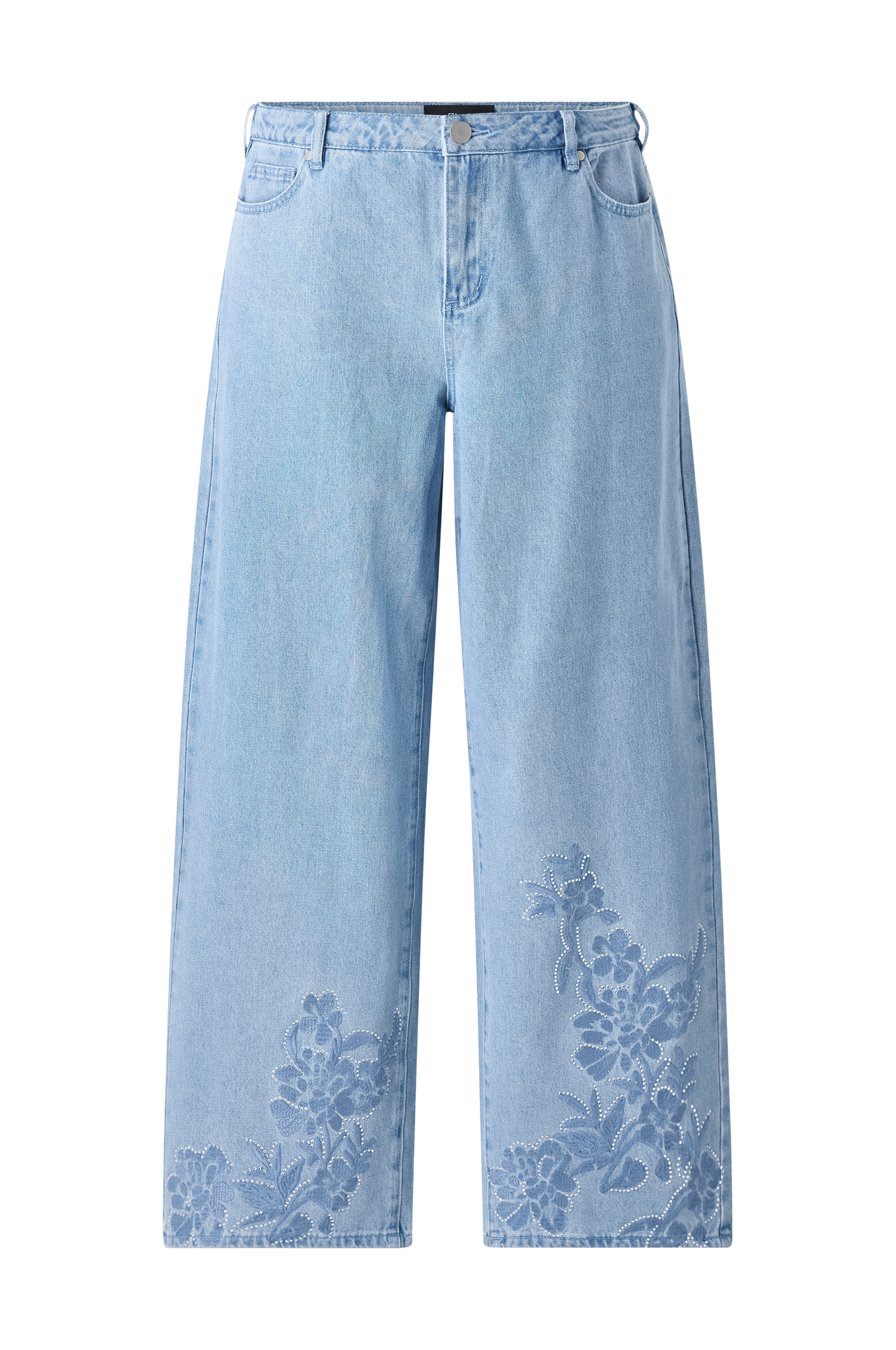 • Högmidjade jeans med dekorativ brodyr och strasstenar nedtill