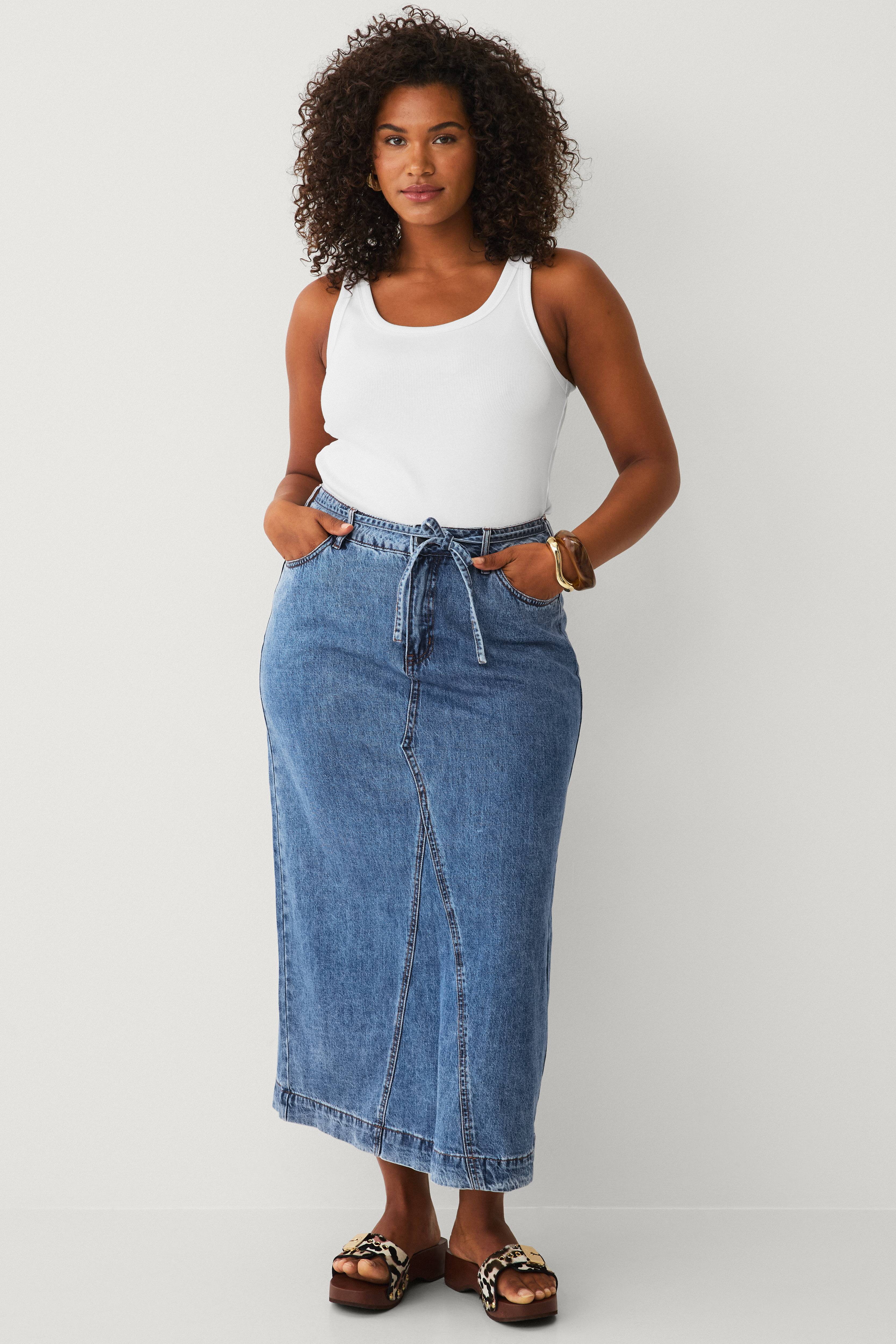• Lång kjol i bomullsdenim• Dragkedjegylf• Två framfickor• Avtagbart knytskärp i midjan• Plusstorlekar• Längd: 92 cm i storlek 42