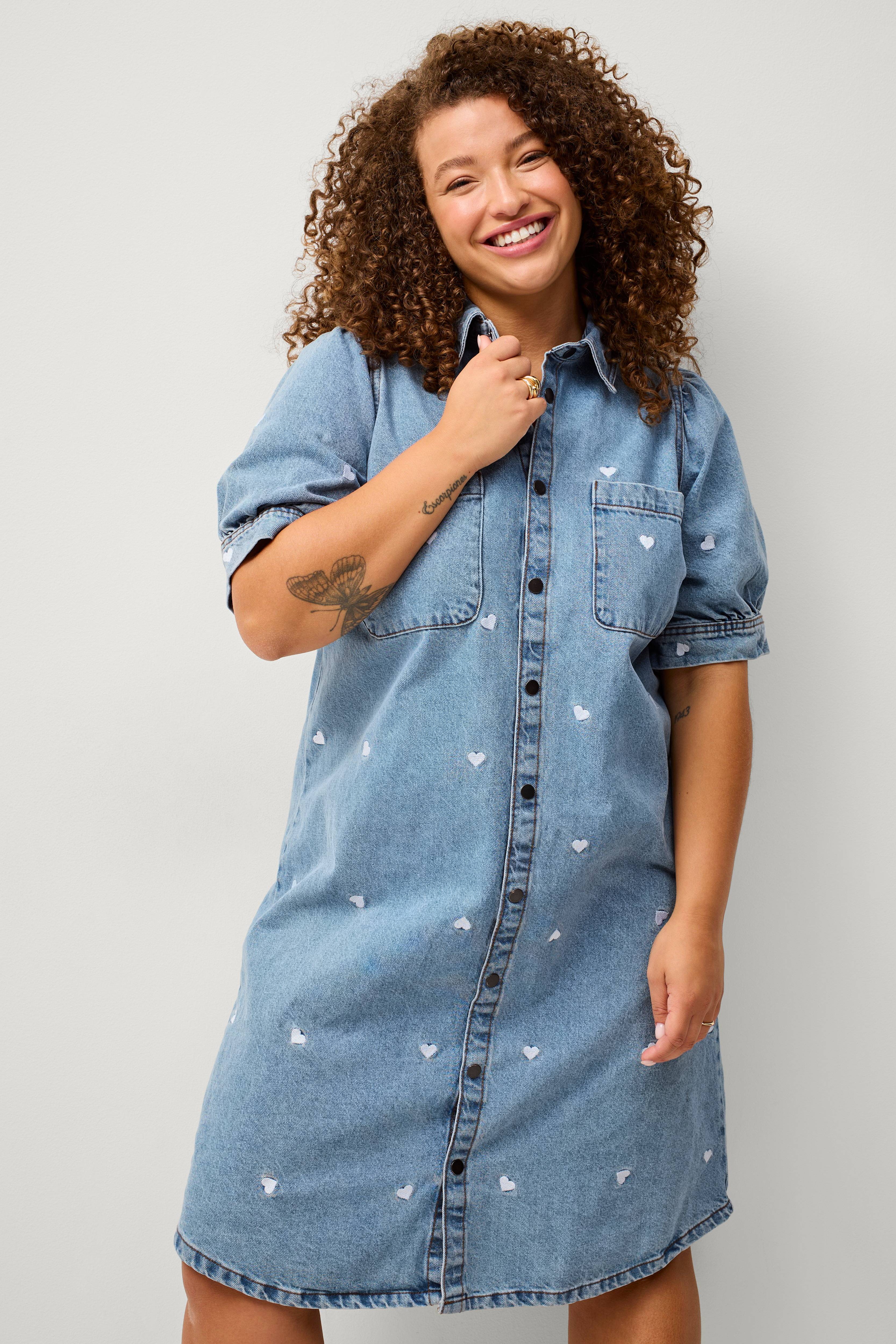 • Skjortklänning i denim med broderade hjärtan• Tryckknappar fram• Korta ärmar• Bröstfickor• Plusstorlekar• Längd: 102 cm i storlek S