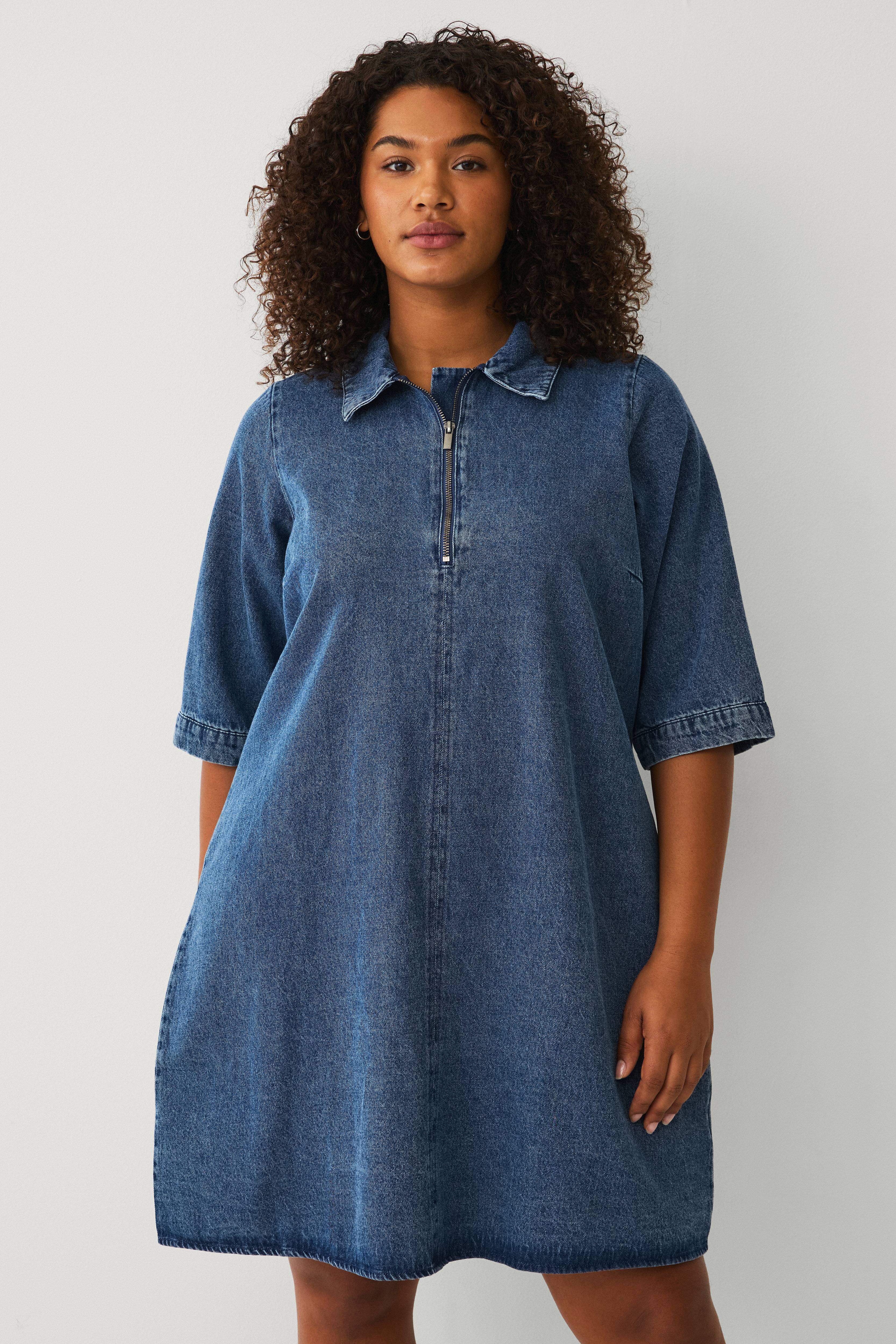 • Jeansklänning med rak passform• Skjortkrage• Kort dragkedja upptill fram• 3/4-långa ärmar• Plusstorlekar• Längd: 94 cm i storlek S