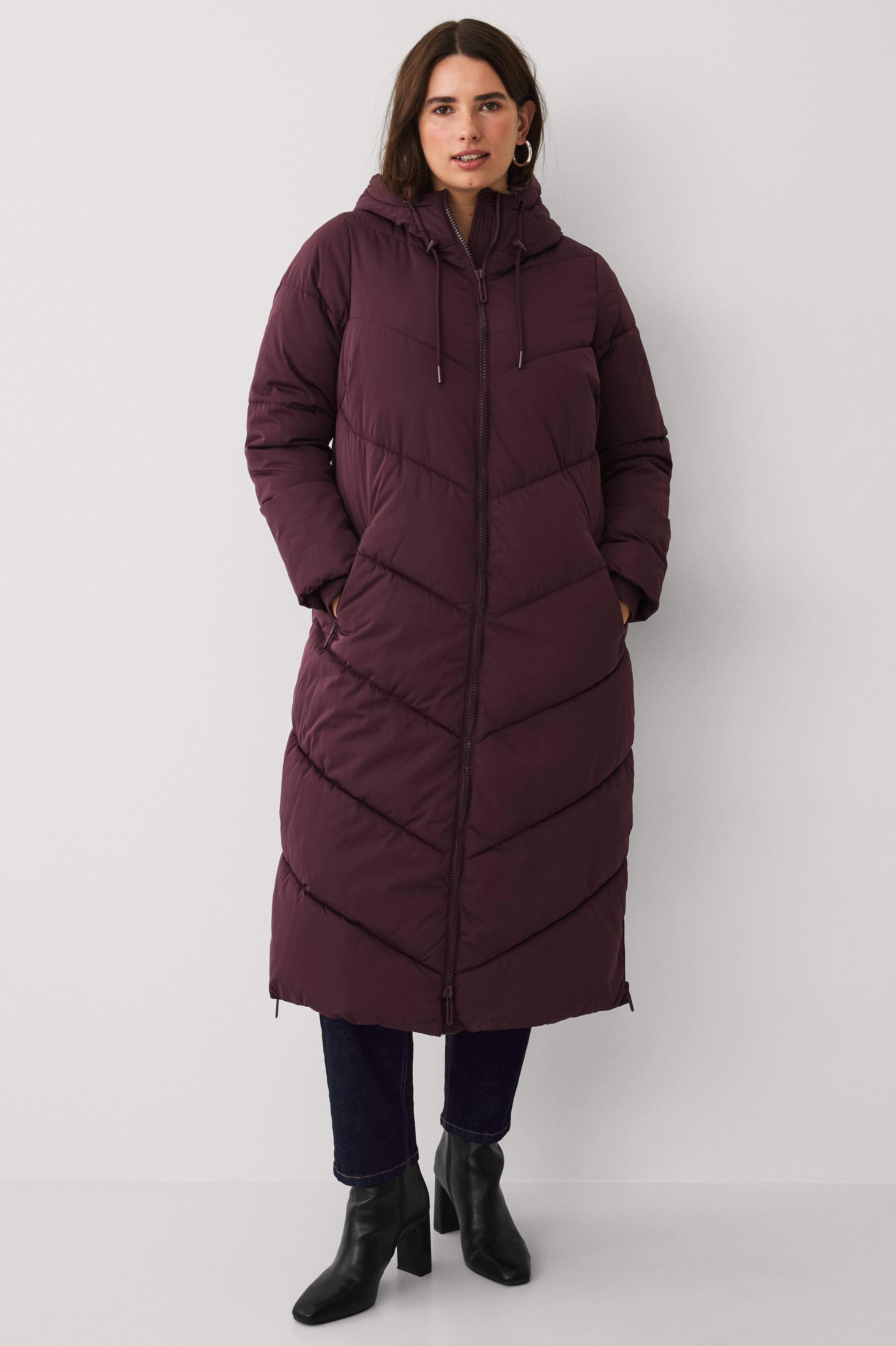 • Lång, quiltad, vadderad pufferkappa • Fast huva med dragsko • Tvåvägsdragkedja • Två fickor med dragkedja • En innerficka med dragkedja • Ribbmuddar i ärmsluten • Slitsar med dragkedjor nedtill i sidorna • Längd: 117 cm i storlek S