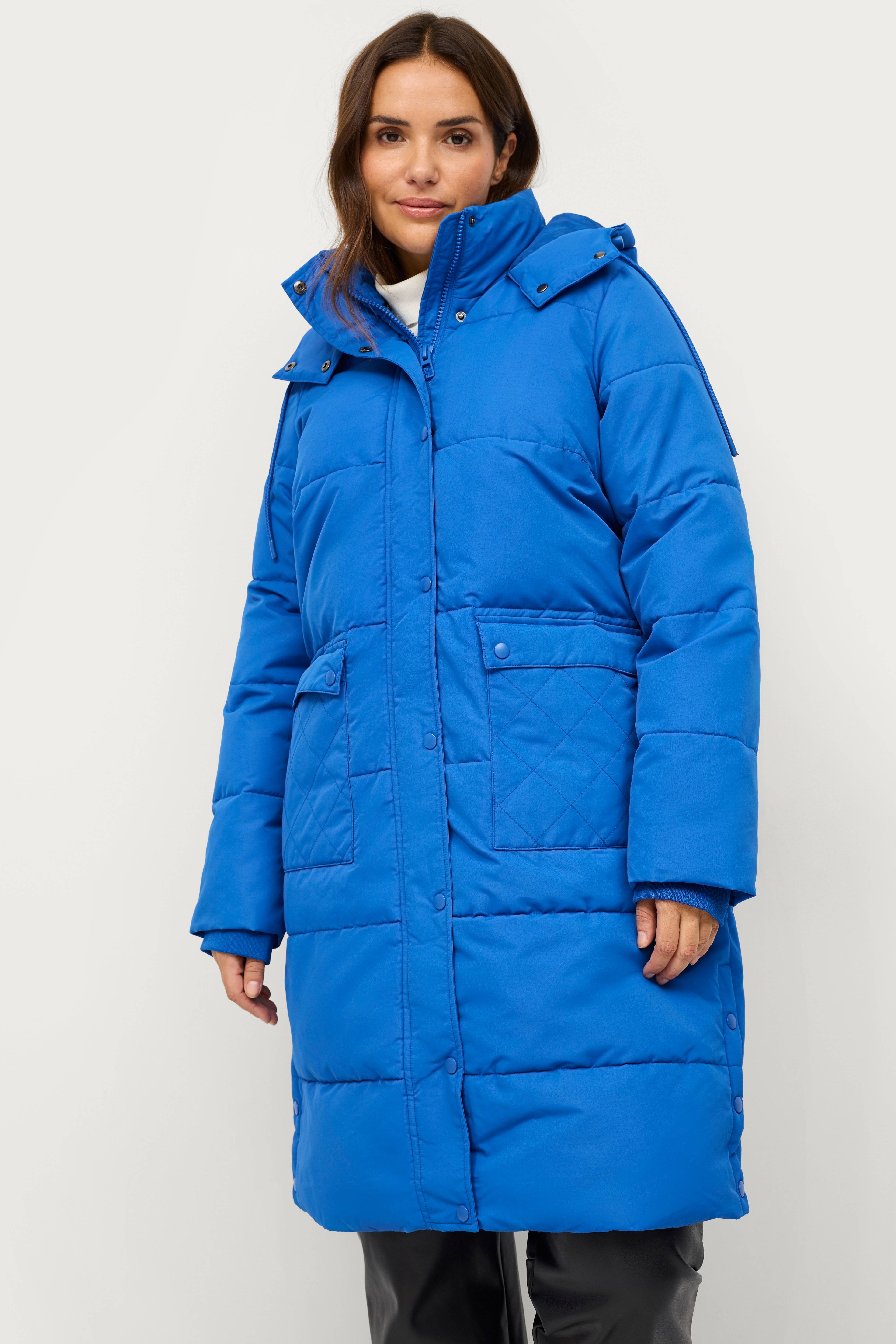 • Quiltad, vadderad kappa • Fast huva med dragsko • Tvåvägsdragkedja • Vindslå över dragkedjan med tryckknappar • Två fickor med tryckknappsstängning • Ribbmuddar i ärmsluten • Slitsar med tryckknappar nedtill i sidorna • Plusstorlekar • Längd: 102 cm i storlek S