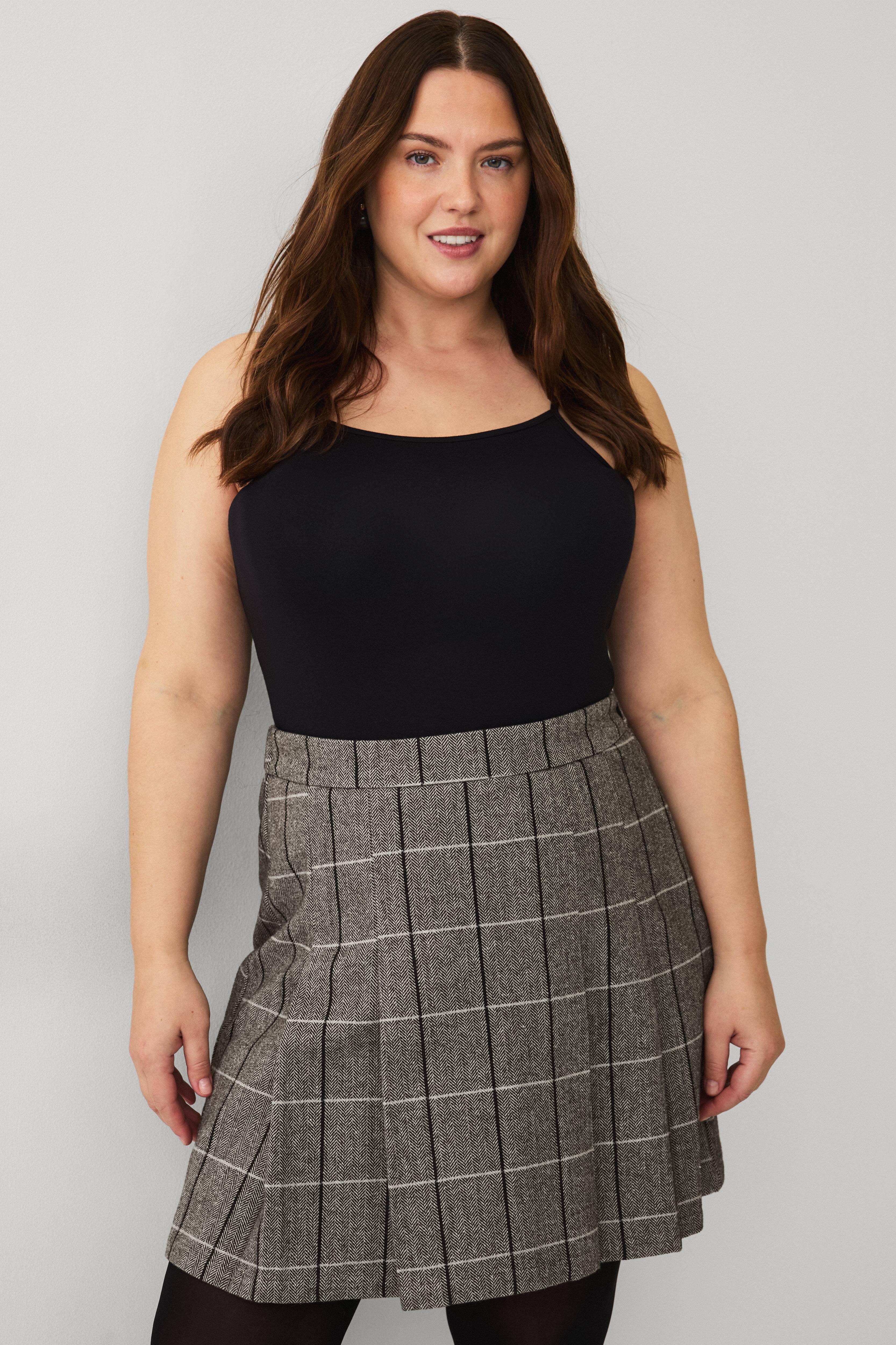 • Kort, plisserad kjol med fiskbensmönster