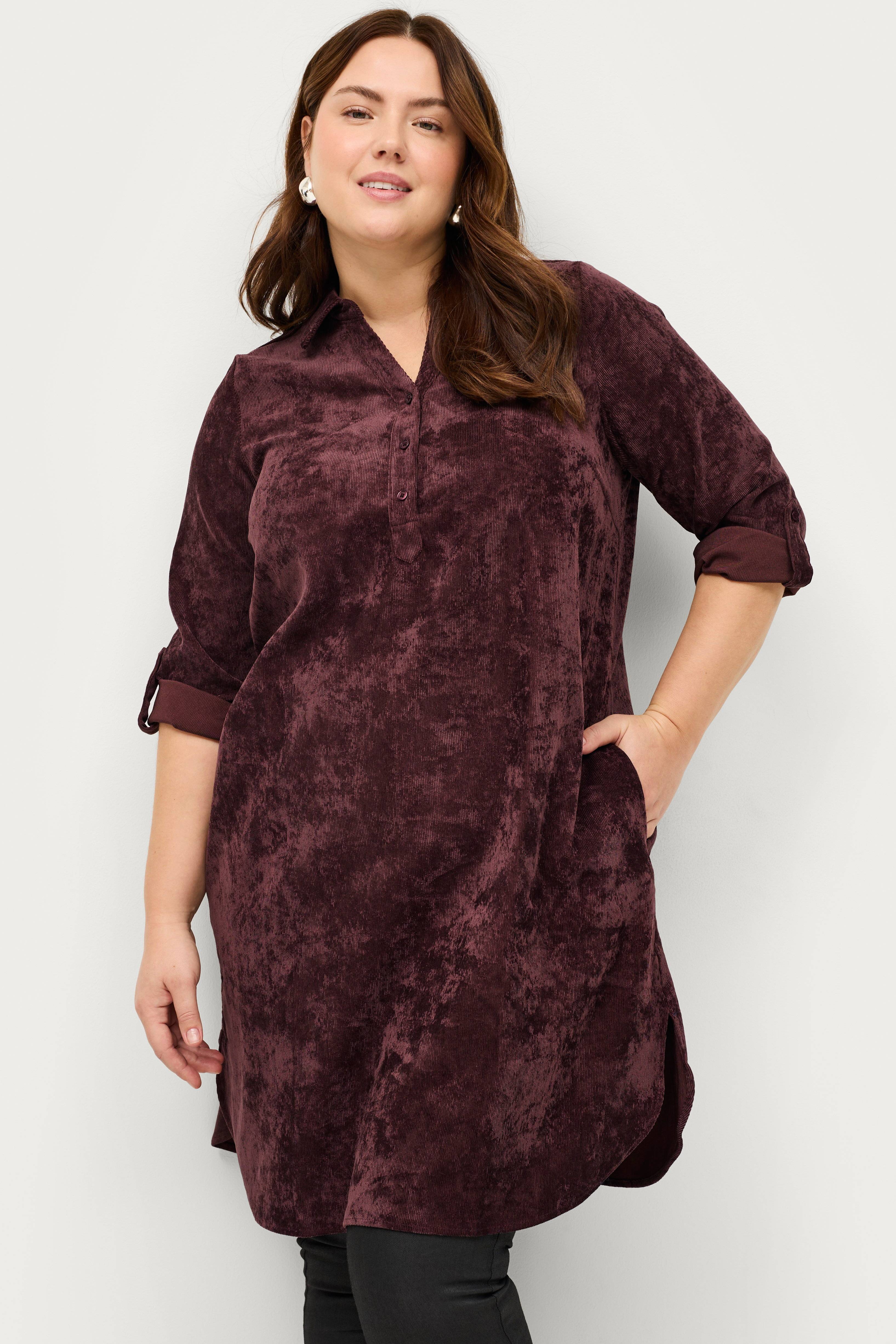 • Klänning i mjuk sammet med randig struktur• Tre knappar fram• 3/4-långa, uppvikbara ärmar• Slitsar nedtill i sidorna• Plusstorlekar• Längd: 103 cm i storlek S