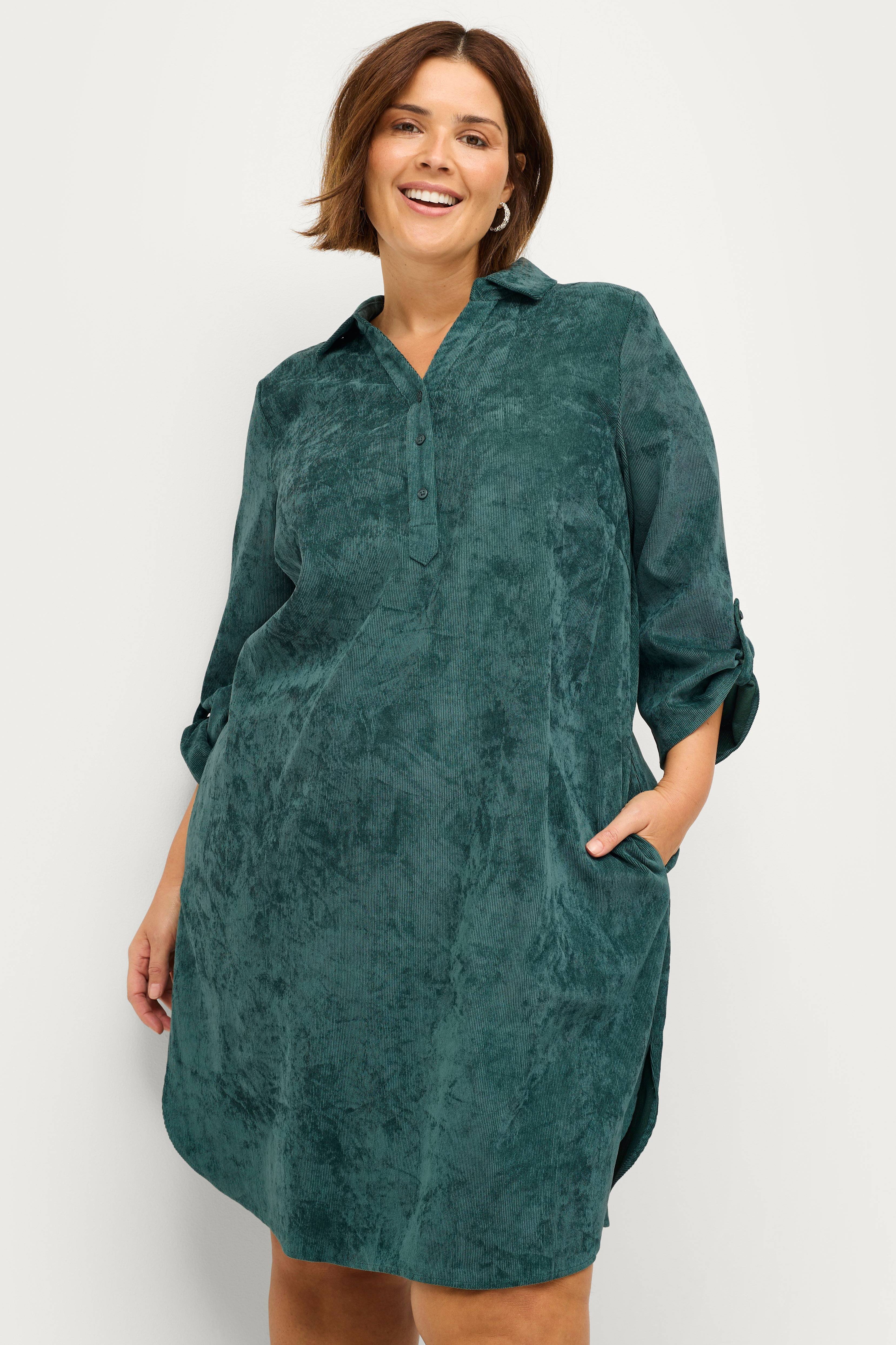 • Klänning i mjuk sammet med randig struktur• Tre knappar fram• 3/4-långa, uppvikbara ärmar• Slitsar nedtill i sidorna• Plusstorlekar• Längd: 103 cm i storlek S