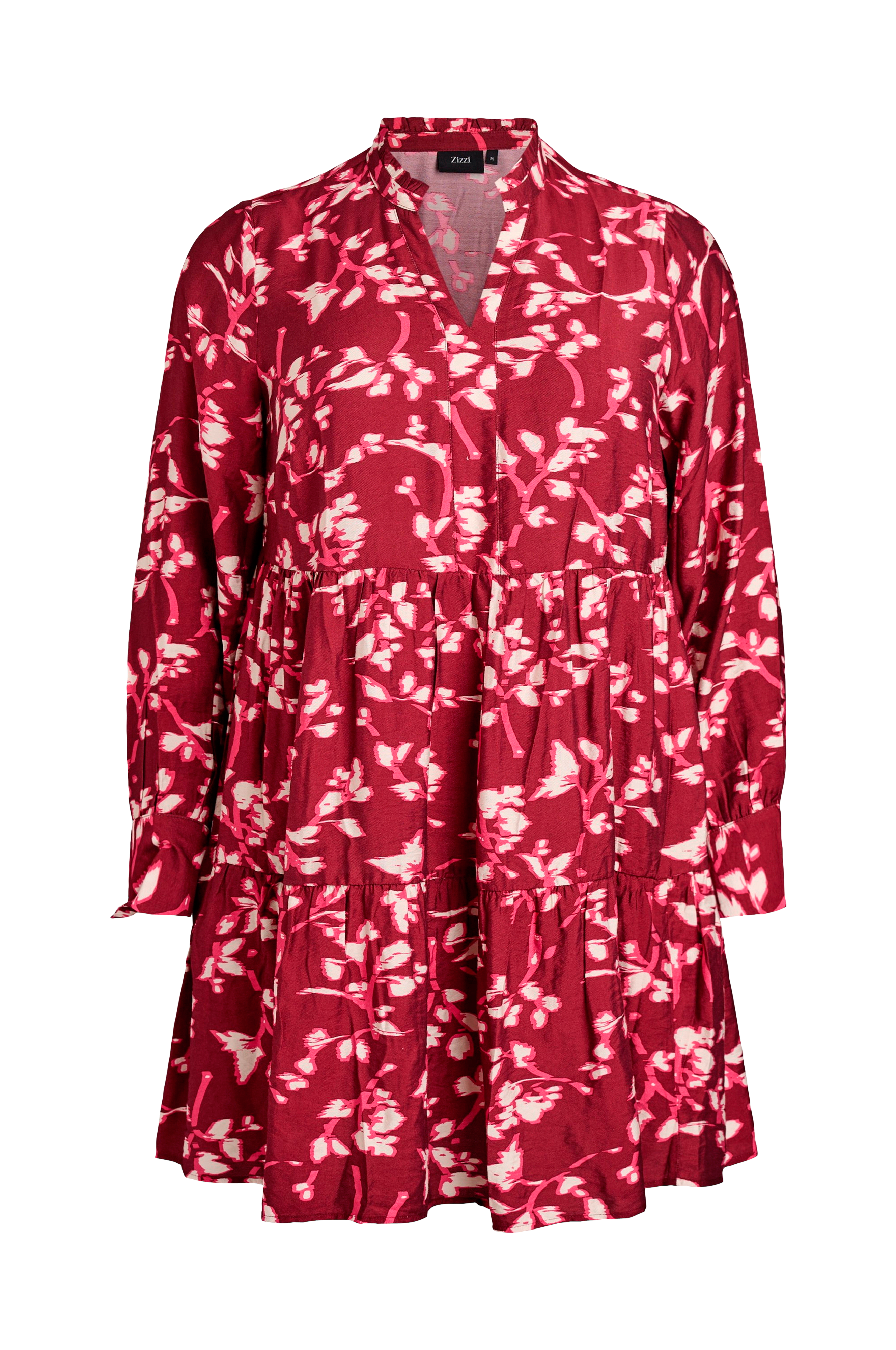 • Mjuk, tunn klänning i viskos• Kort ståkrage med volang• V-ringad hals• Långa ärmar med draperingsveck• Manschetter med två knappar• Utställd kjol med volanger• Längd: 88 cm i storlek• Plusstorlekar