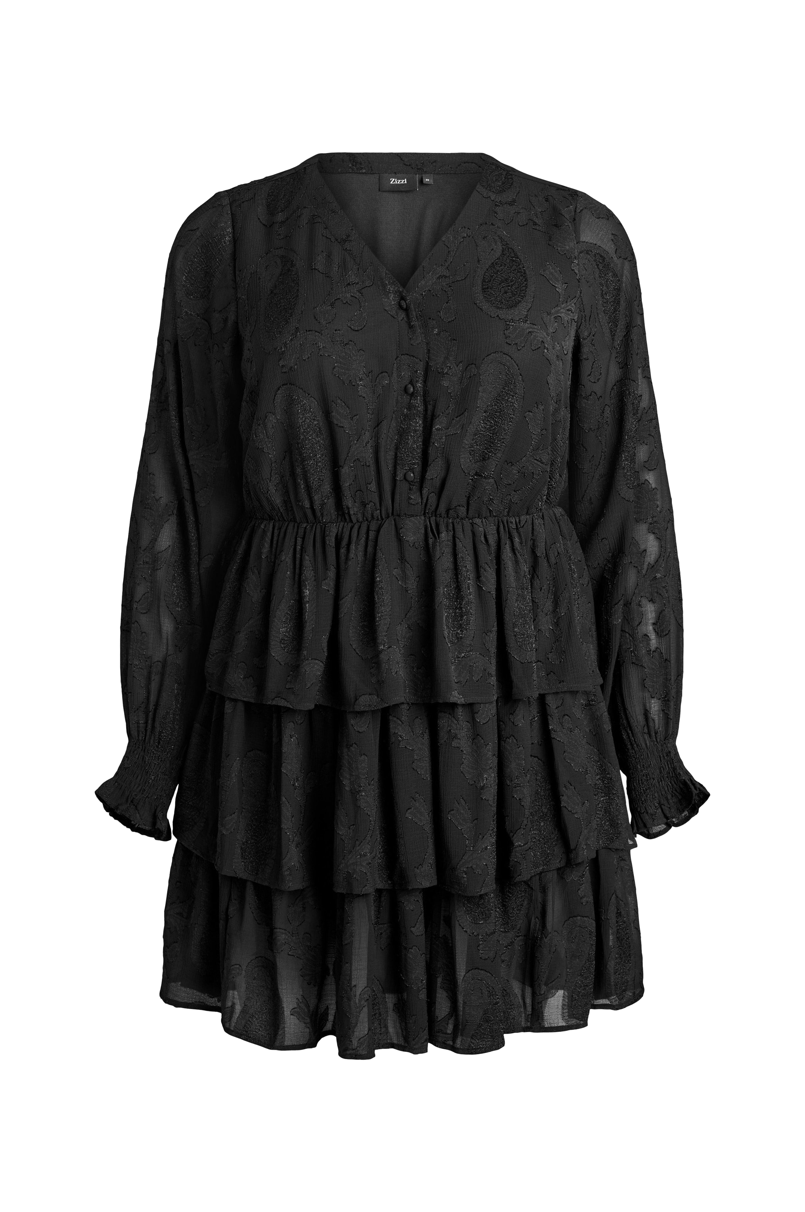 • Fodrad klänning i chiffong• V-ringning• Långa ärmar• Knappstängning• Resår i midjan• Dekorativa volanger• Plusstorlekar• Längd: 95 cm i storlek S
