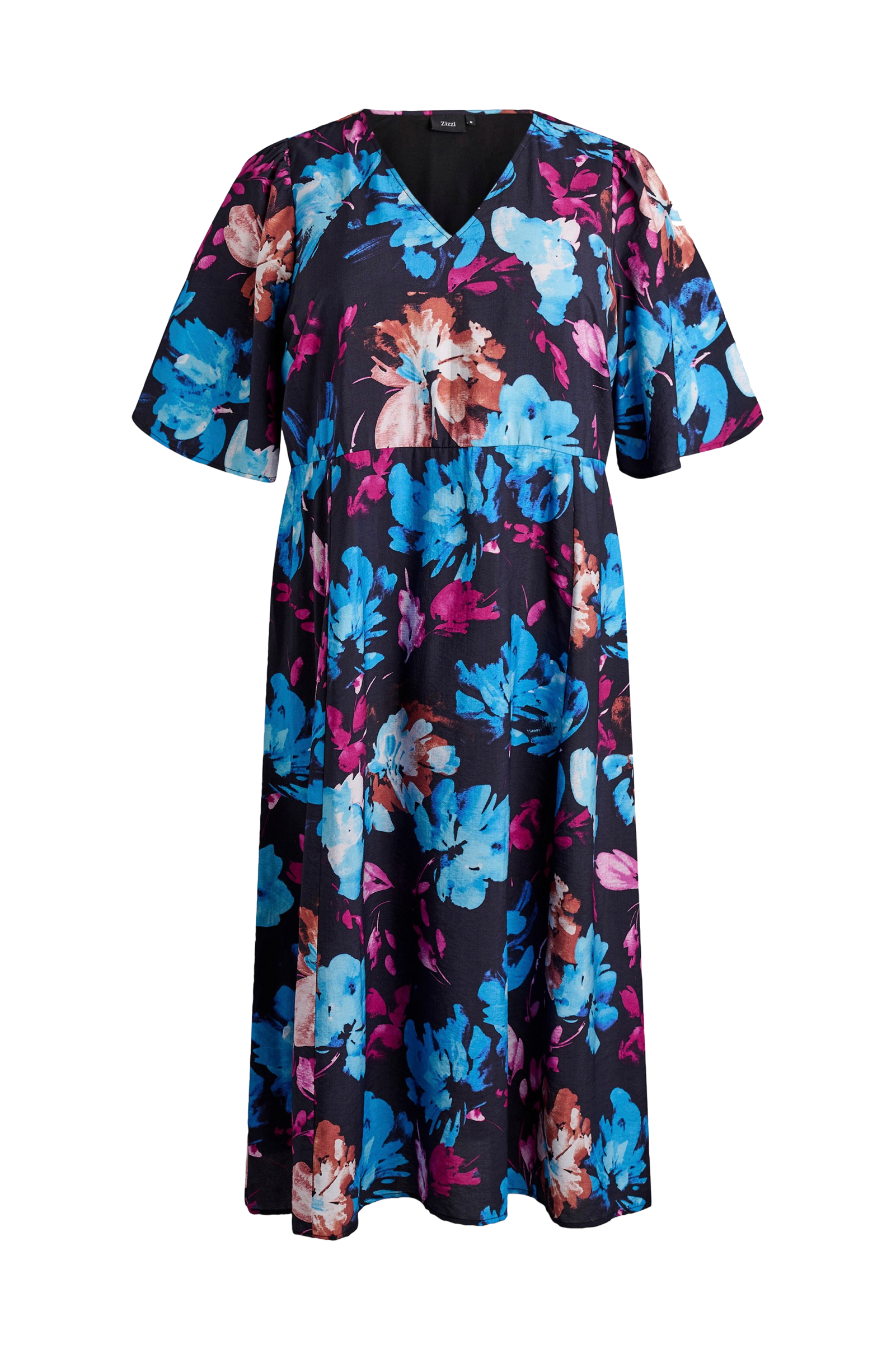 • Klänning i lätt krinklat material• V-ringning• Korta, utsvängda puffärmar• Avskärning i midjan• Dold dragkedja i ena sidan• Textilfoder• Plusstorlekar• Längd: 128 cm i storlek S