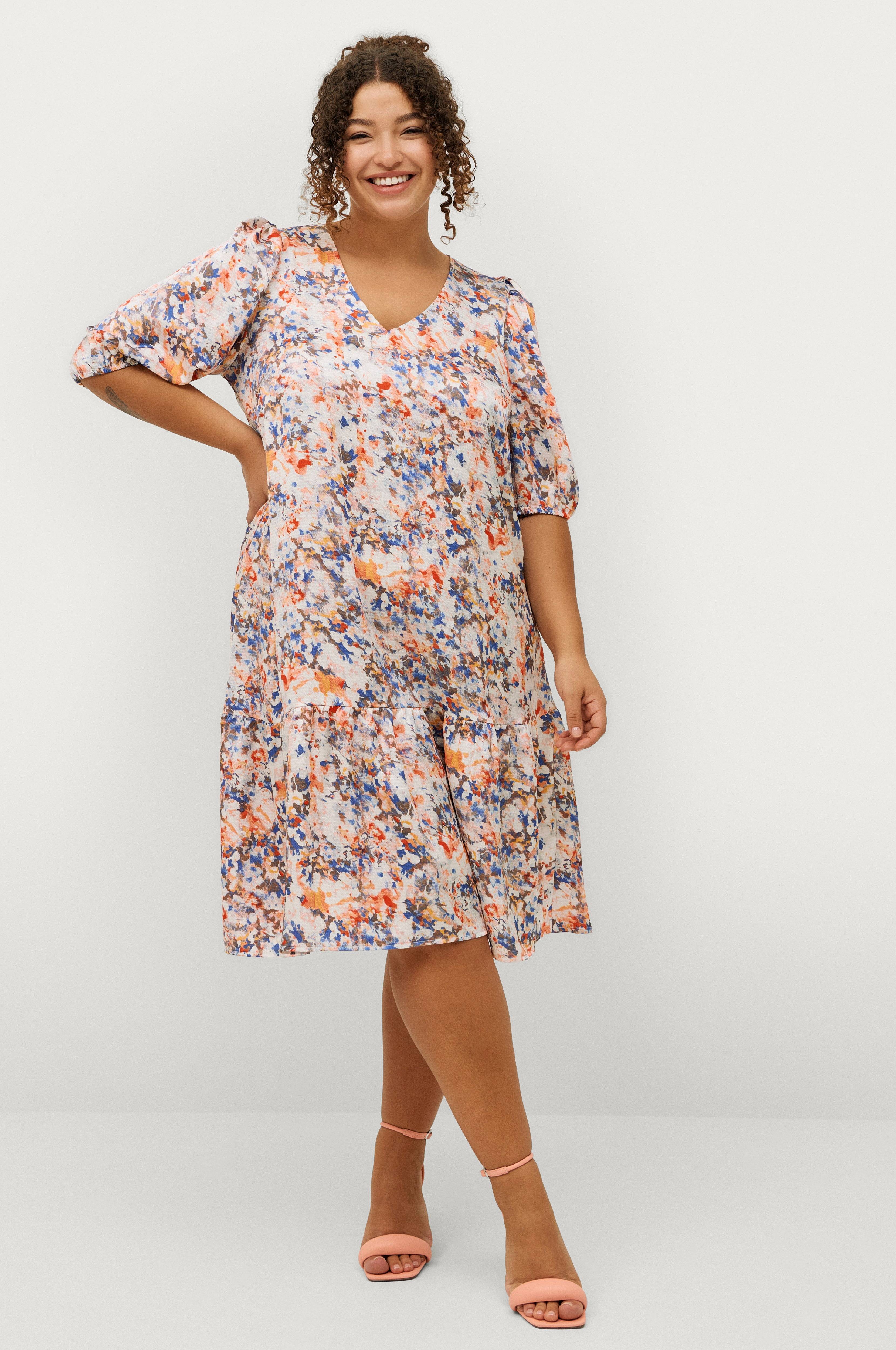 • V-ringning• 3/4-långa puffärmar• Volang nedtill• Plusstorlekar• Längd: 106 cm i storlek S