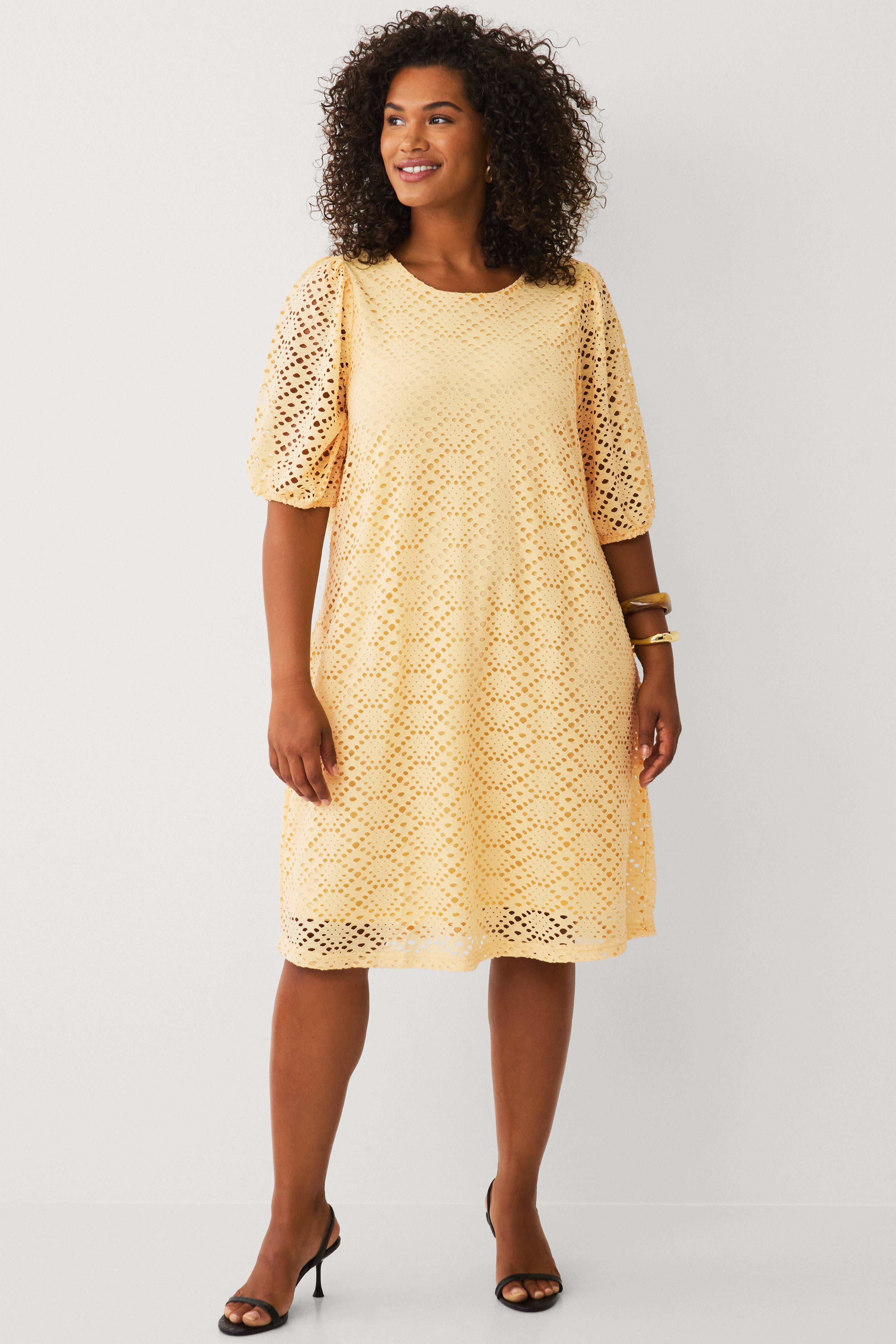 • Knälång klänning med hålmönster • Rund halsringning • Halvlånga puffärmar med elastiska muddar • Innerfoder i stretchig trikå • Plusstorlekar • Längd: 100 cm i storlek S