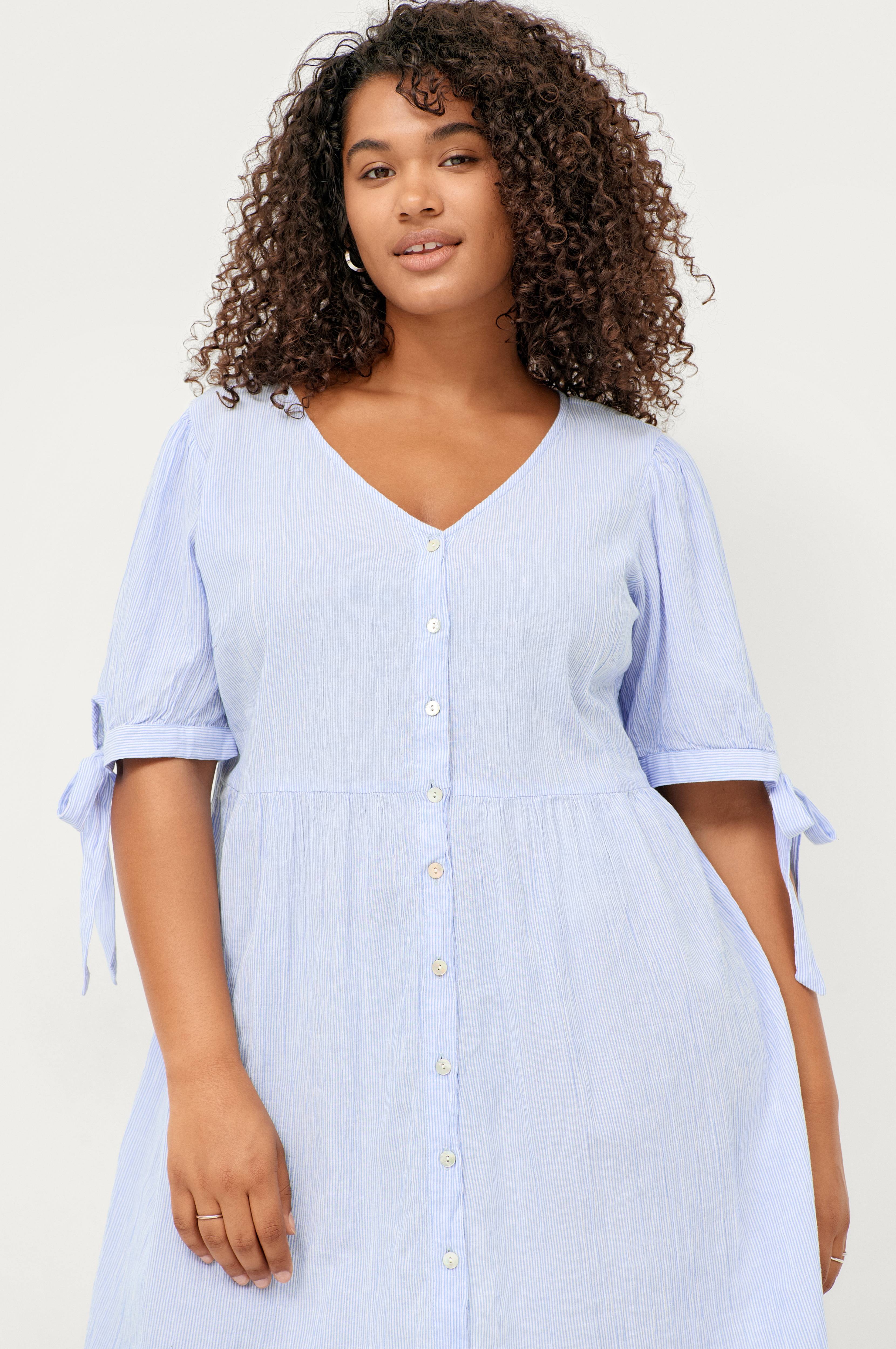 • Plusstorlekar• Nätt modell i bomull• V-ringning• Knappar fram• Halvlånga ärmar med knytning i ärmsluten• Längd: 96 cm i storlek S