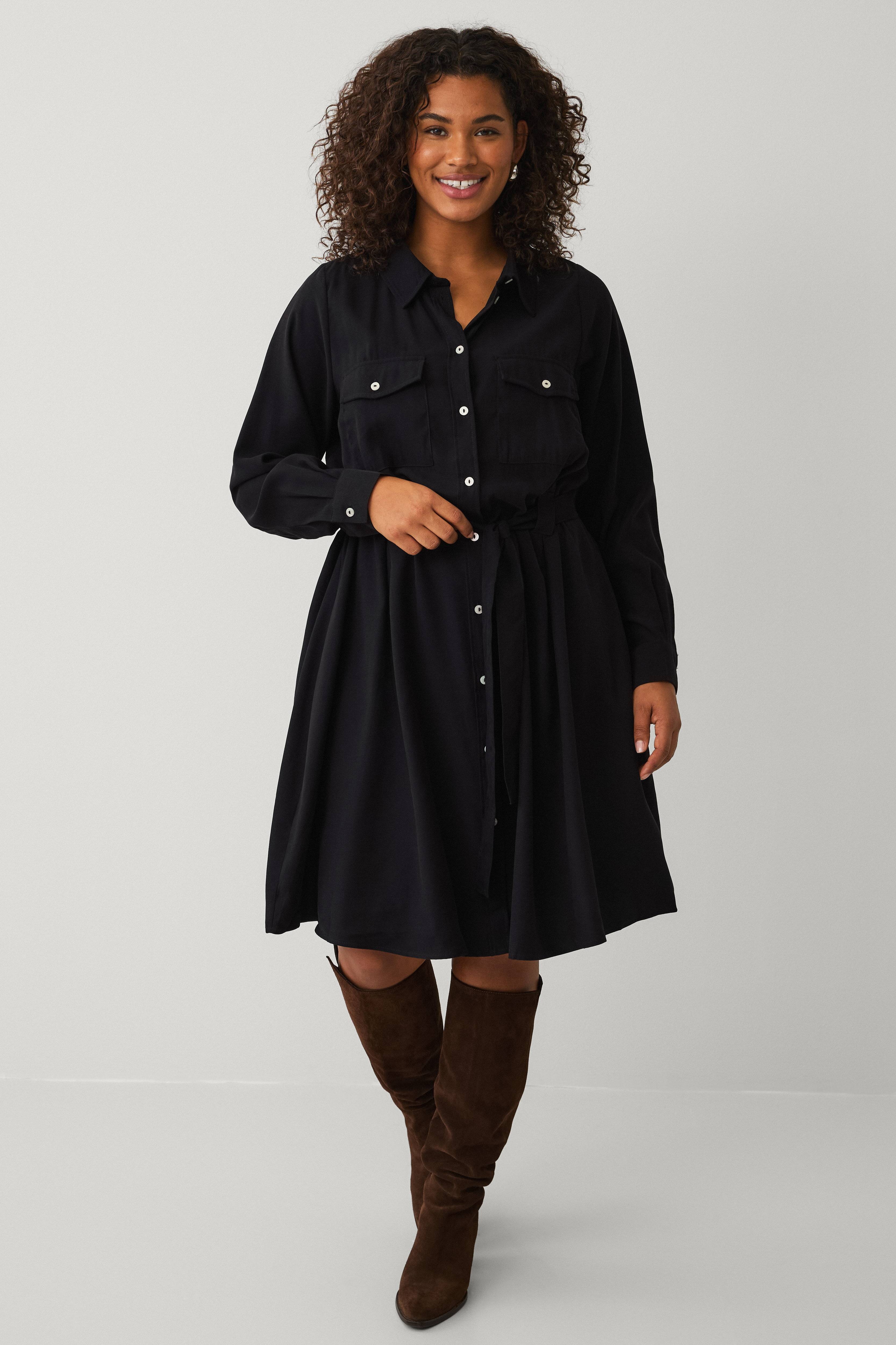 • Långärmad skjortklänning med knytskärp i midjan• Knappar hela vägen fram• Bröstfickor med lock och knapp• Motveck vid bälteshällorna• Plusstorlekar• Längd: 106 cm i storlek S