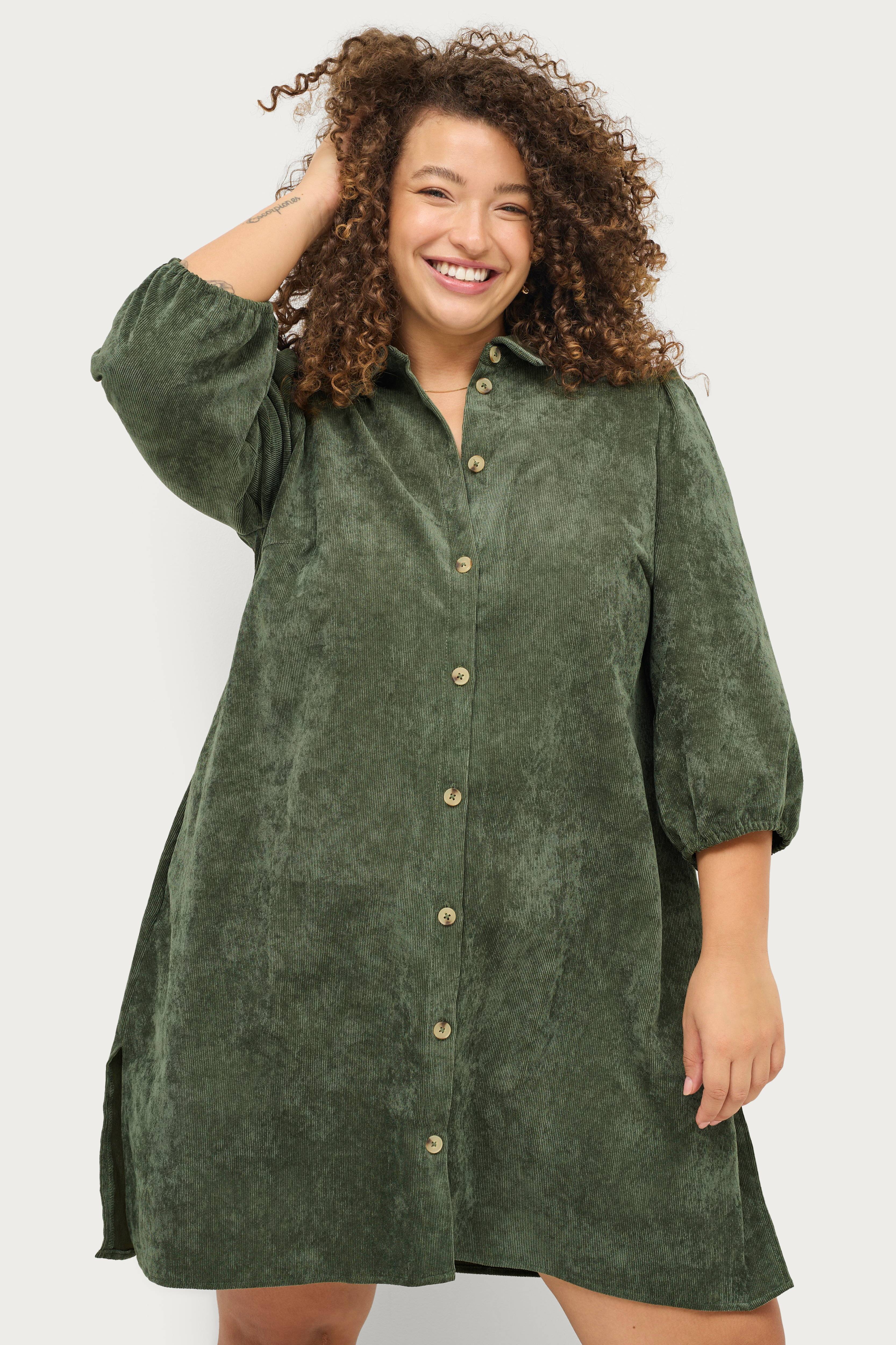 • Plusstorlekar • Utsvängd modell i manchester • Liten krage • Knappar hela vägen fram • 3/4-lång puffärm med elastiskt ärmslut • Sprund nedtill i sidorna • Längd: 93 cm i storlek S