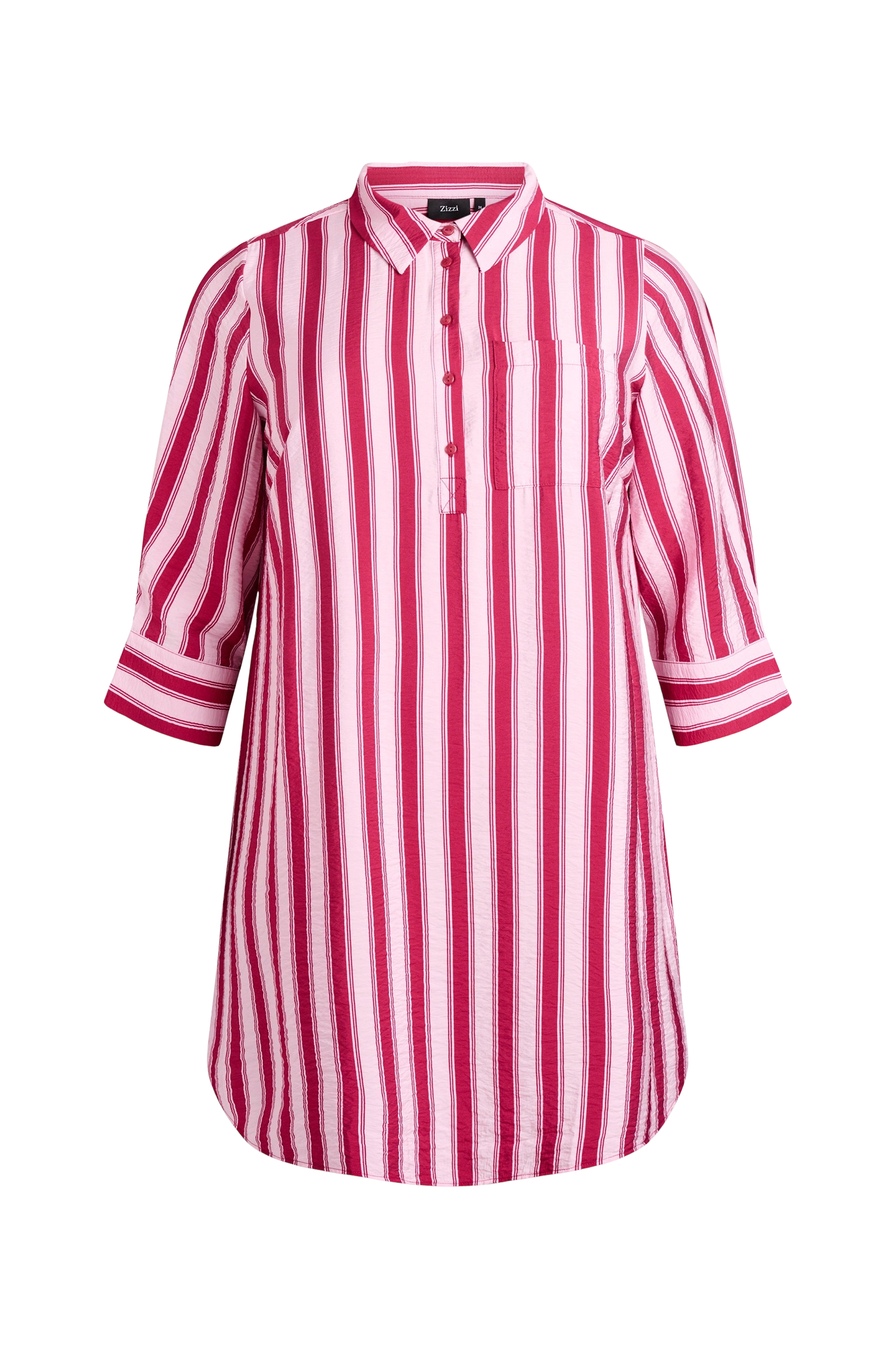 • Plusstorlekar• Utsvängd modell i kräppkvalitet• Liten krage• Kort knappslå• En bröstficka• Rak ärm med manschett• Rundade sprund nedtill i sidorna• Längd: 97 cm i storlek S