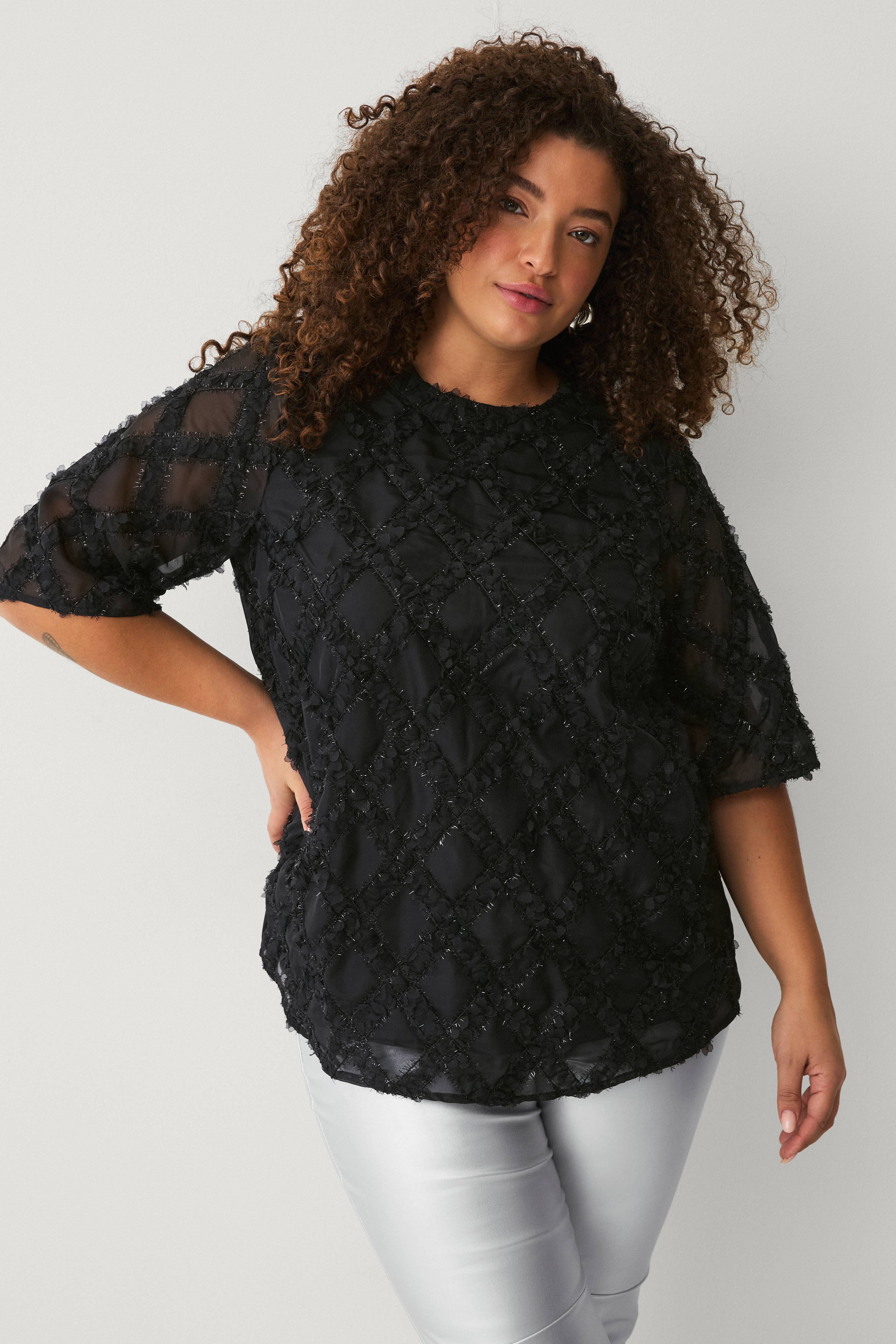 • Rak modell i organza med glittrigt strukturmönster fram och på ärmarna