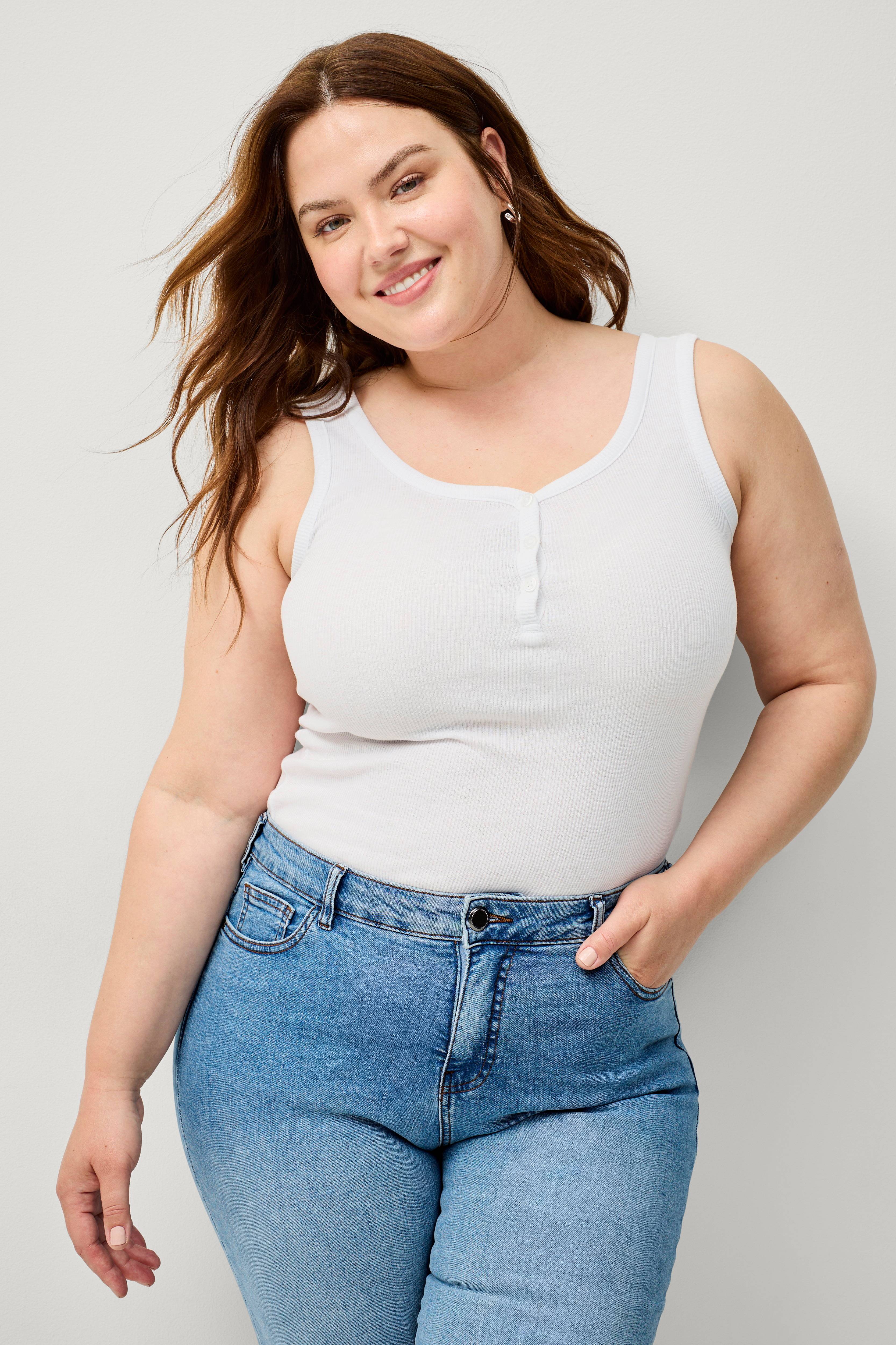 • Ärmlös, ribbstickad modell• V-ringad hals med kort knappslå• Vågig nederkant