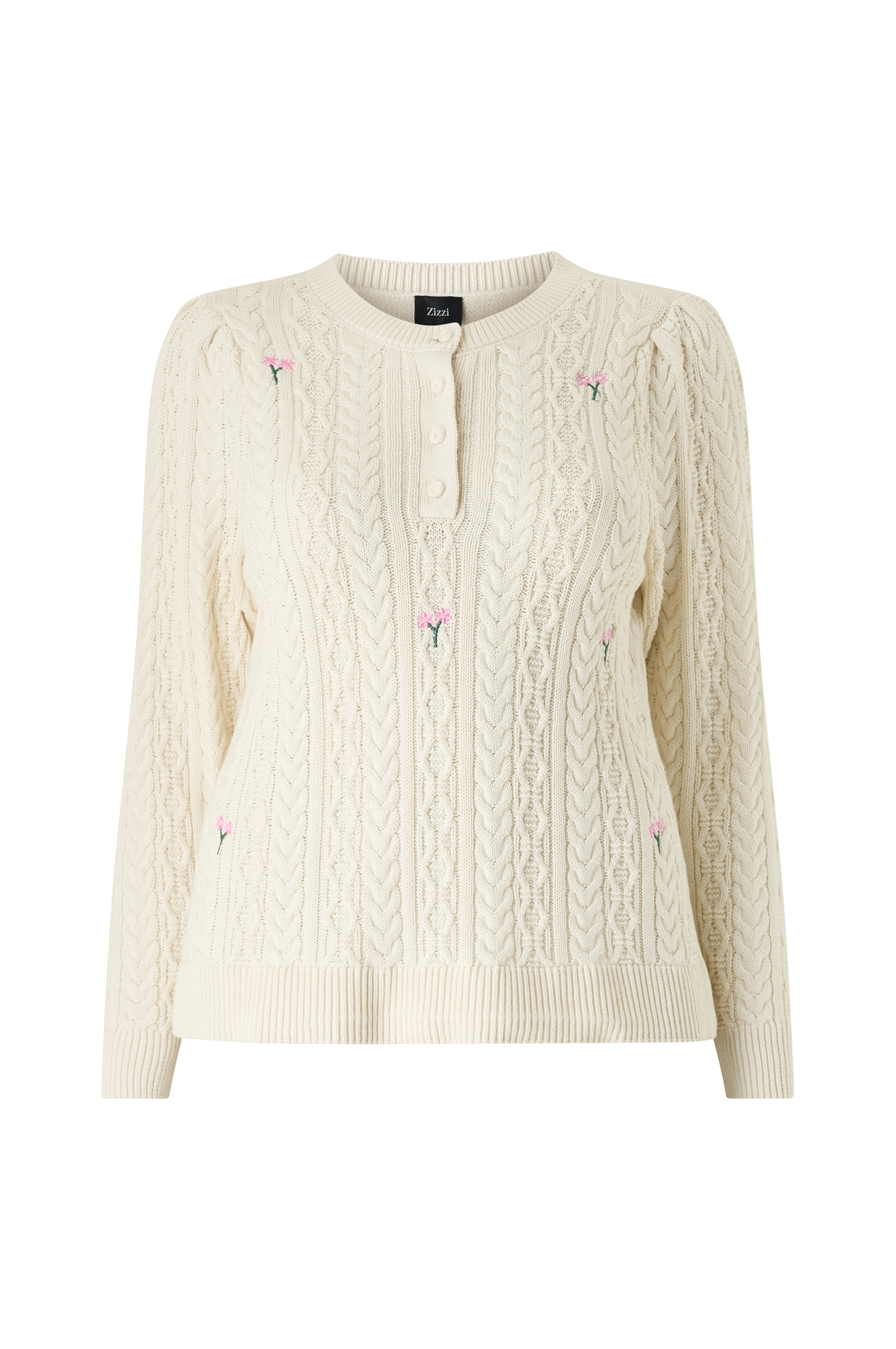 • Mönsterstickad tröja med broderade blommor• Rund, ribbad halsringning• Klädda knappar upptill fram• Ribbstickning i ärmsluten och i nederkanten• Plusstorlekar