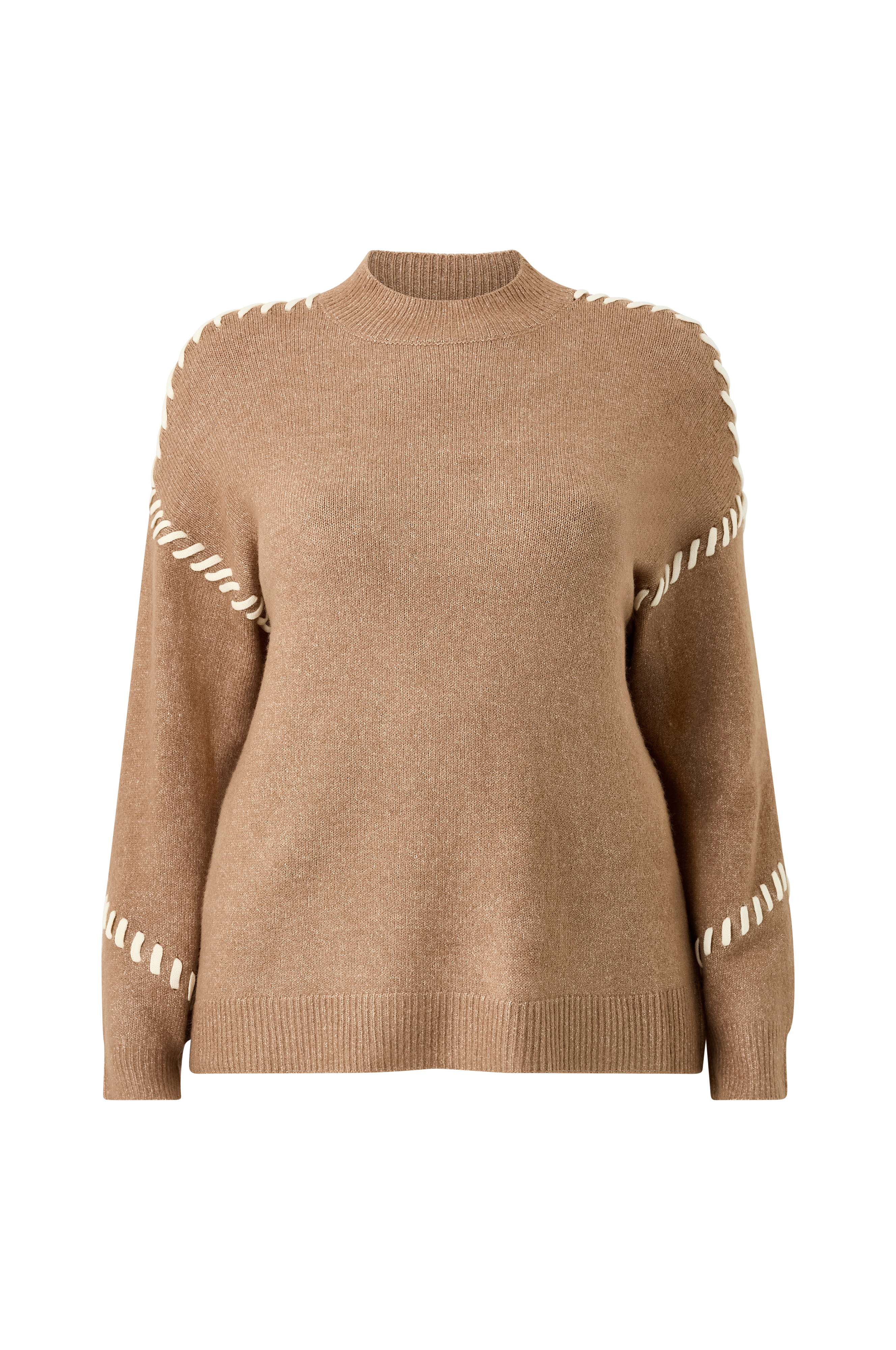 • Mjuk, finstickad tröja• Dekorativa, kontrastfärgade sömmar• Rund, ribbstickad halsringning• Ribbstickning i ärmsluten och i nederkanten• Plusstorlekar