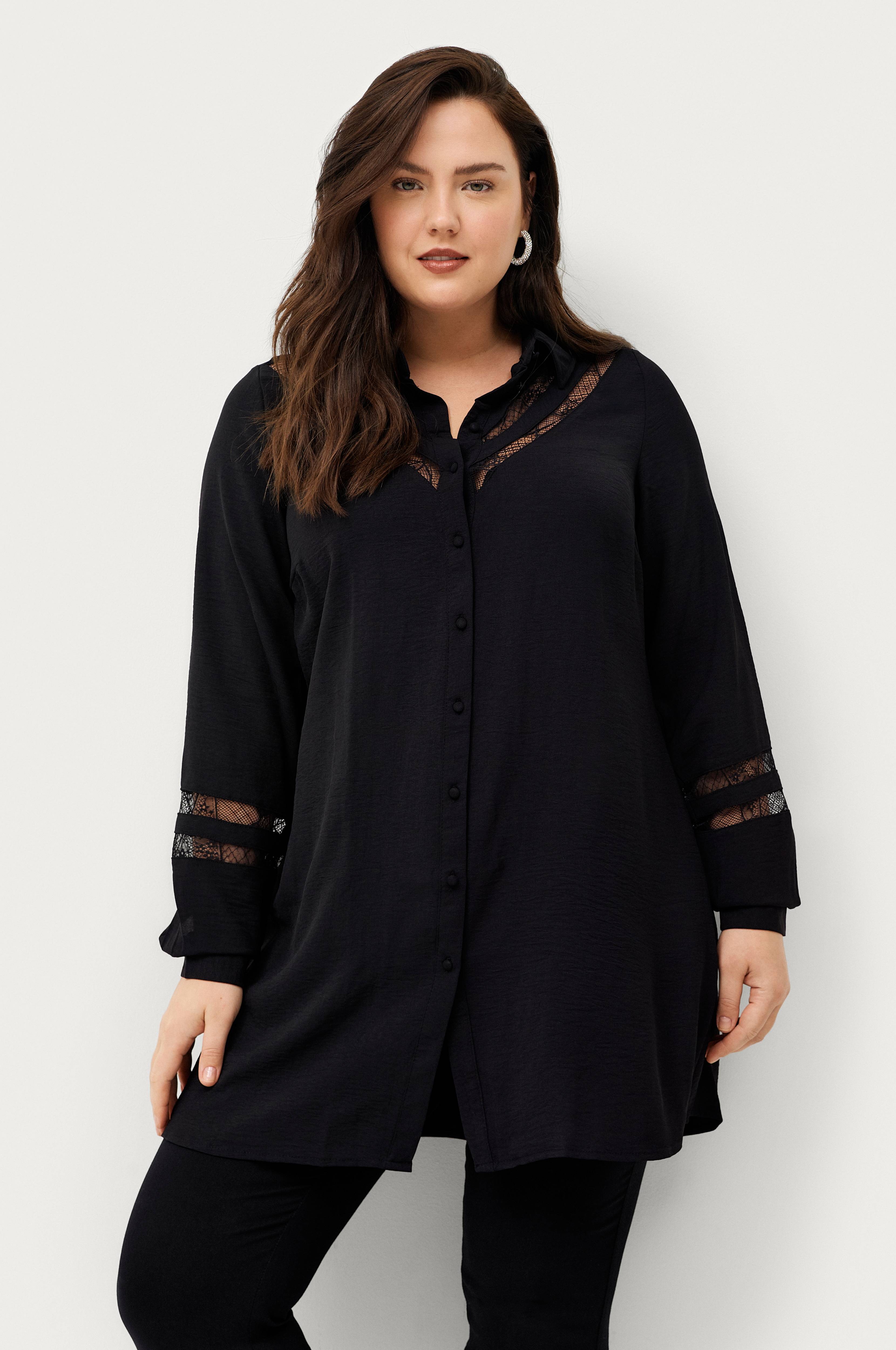 • Spetsdetaljer upptill fram och på ärmarna • Genomknäppt modell • Tygklädda knappar • Långa ärmar med knapp i ärmsluten • Plusstorlekar • Längd: 93 cm i storlek S