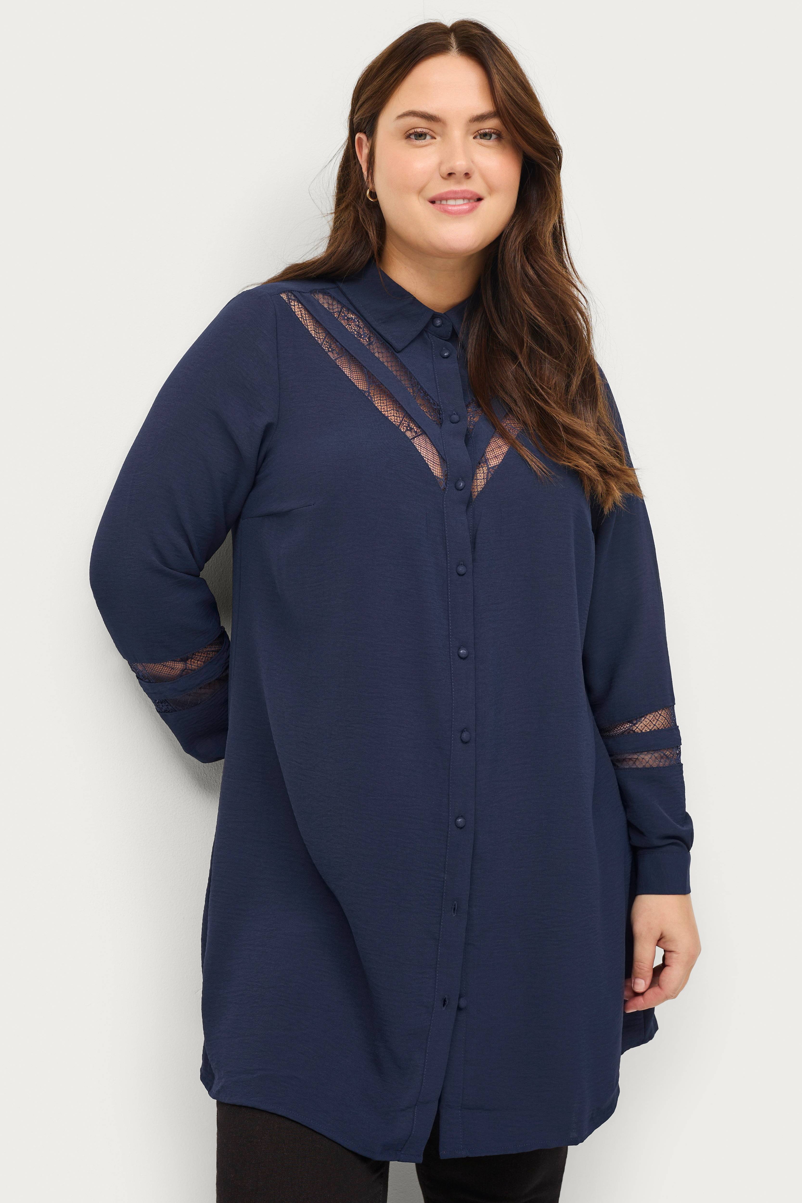 • Spetsdetaljer upptill fram och på ärmarna • Genomknäppt modell • Tygklädda knappar • Långa ärmar med knapp i ärmsluten • Plusstorlekar • Längd: 93 cm i storlek S