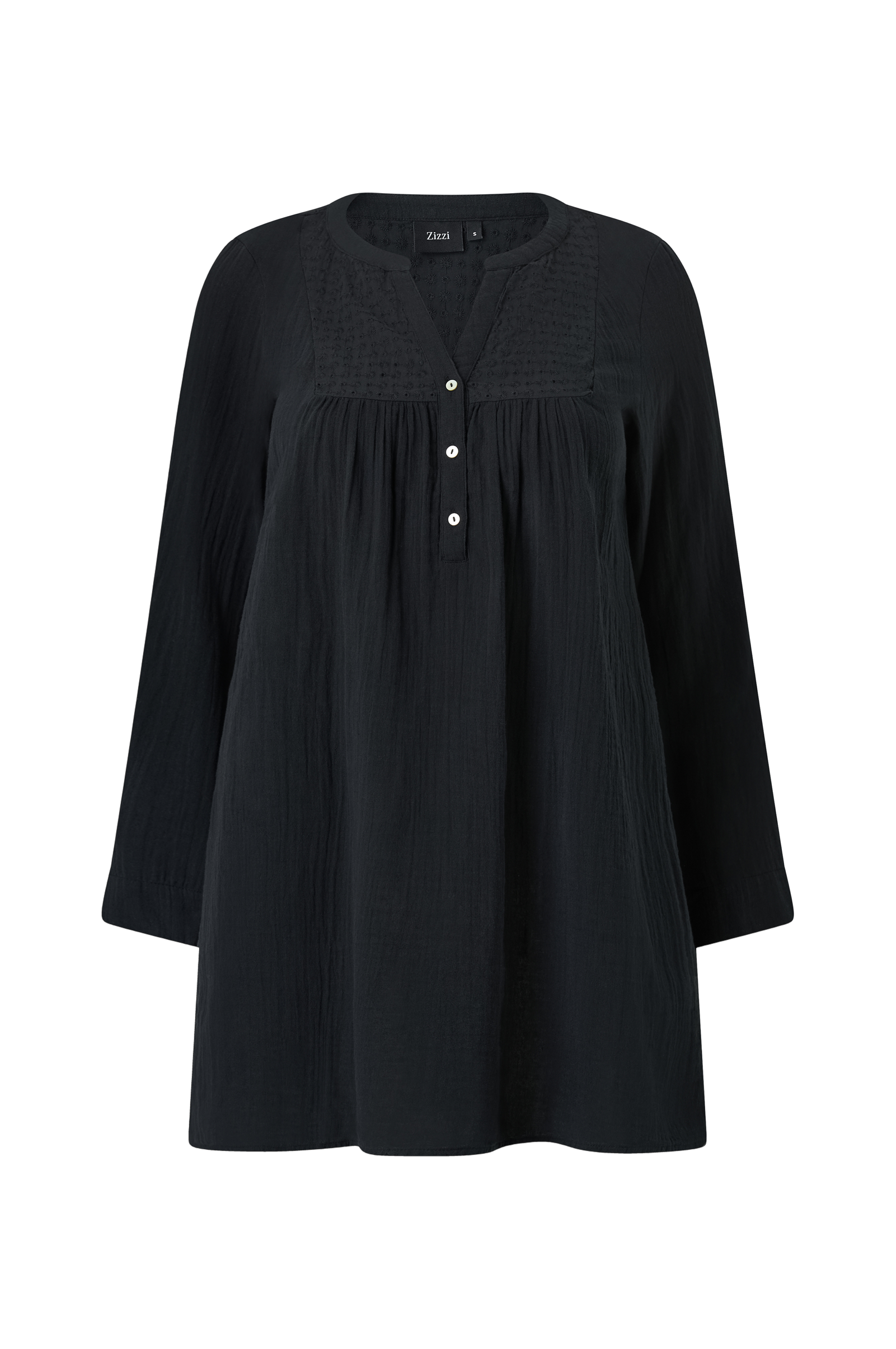 • Broderat hålmönster upptill• V-ringning• Knappar• Upprullade ärmar• Mjuk, strukturerad kvalitet• Plusstorlekar• Längd: 89 cm i storlek S