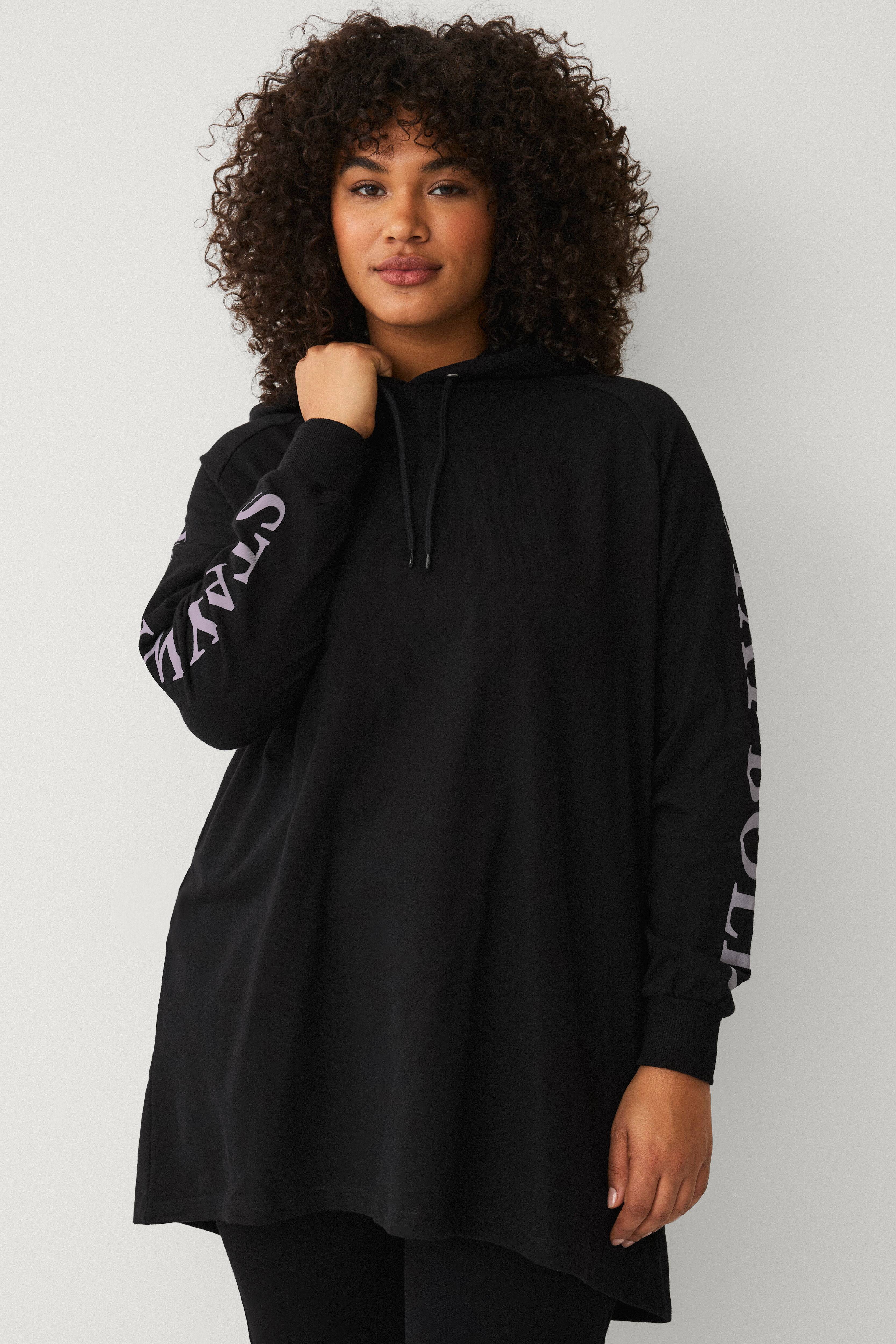 • Plusstorlekar• Ledig modell i sweatshirttyg• Fodrad huva med dragsko• Raglanärm med stora tryck och ribbmudd• Längre, rundad nederkant bak• Längd: 92 cm i storlek S