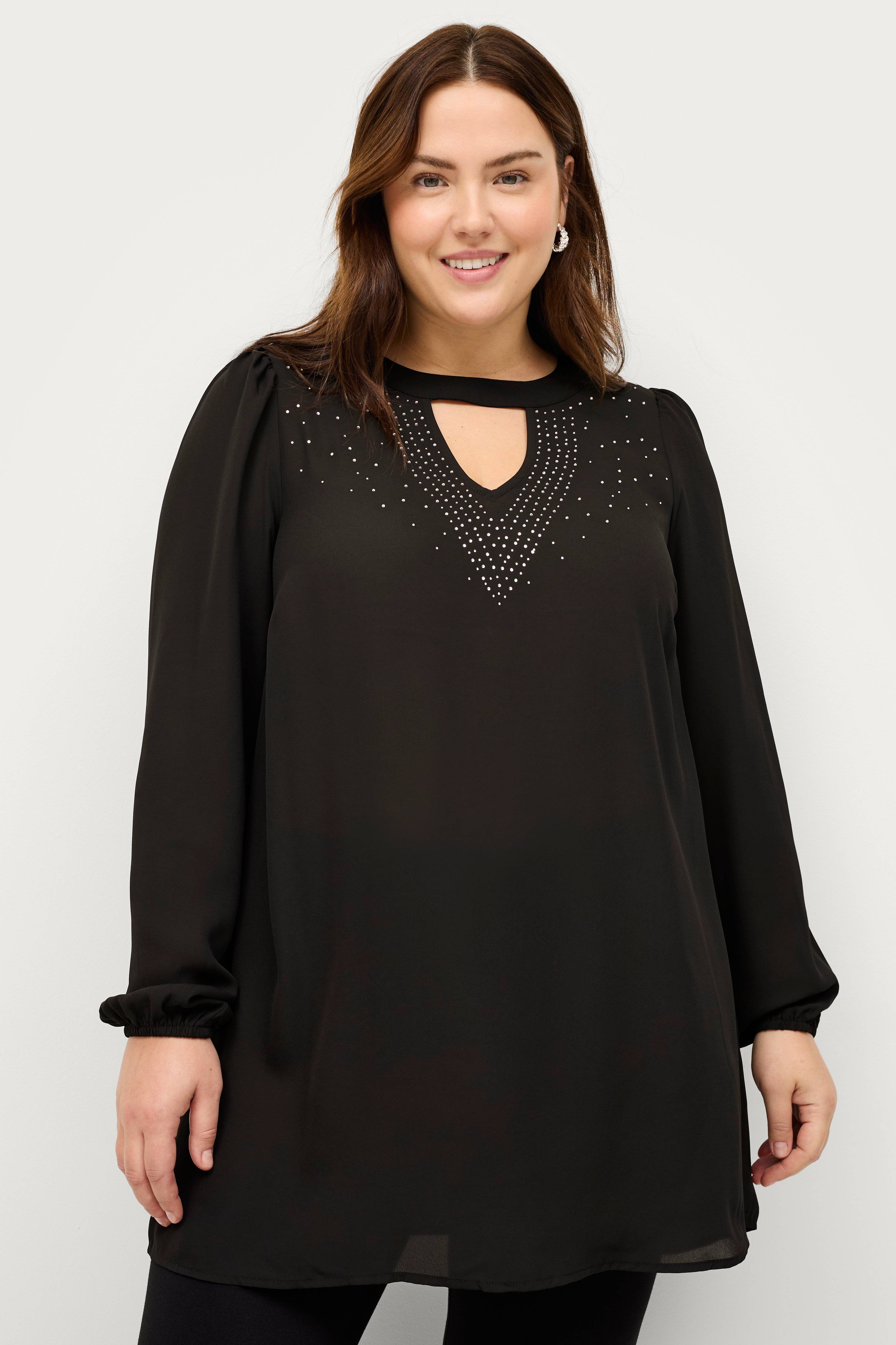 • Dekorativ strass fram• Liten öppning i halsen• Sprund med knapp i nacken• Ballongärmar med elastiska ärmslut• Tunn, vävd kvalitet• Plusstorlekar• Längd: 85 cm i storlek S