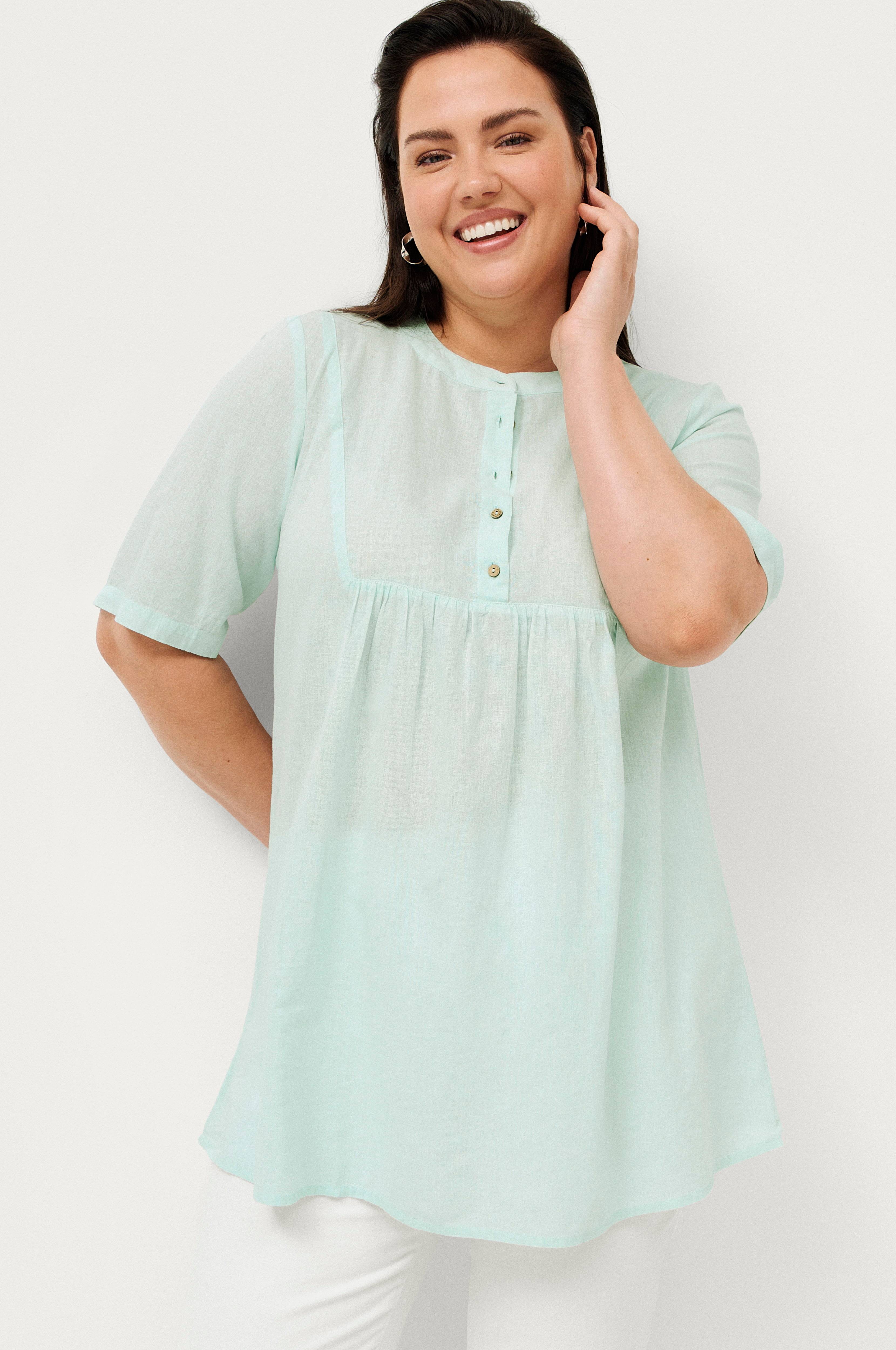 • A-linjeform• Knappar upptill fram• Halvlånga ärmar• Gjord av linnemix• Längd: 85 cm i storlek S