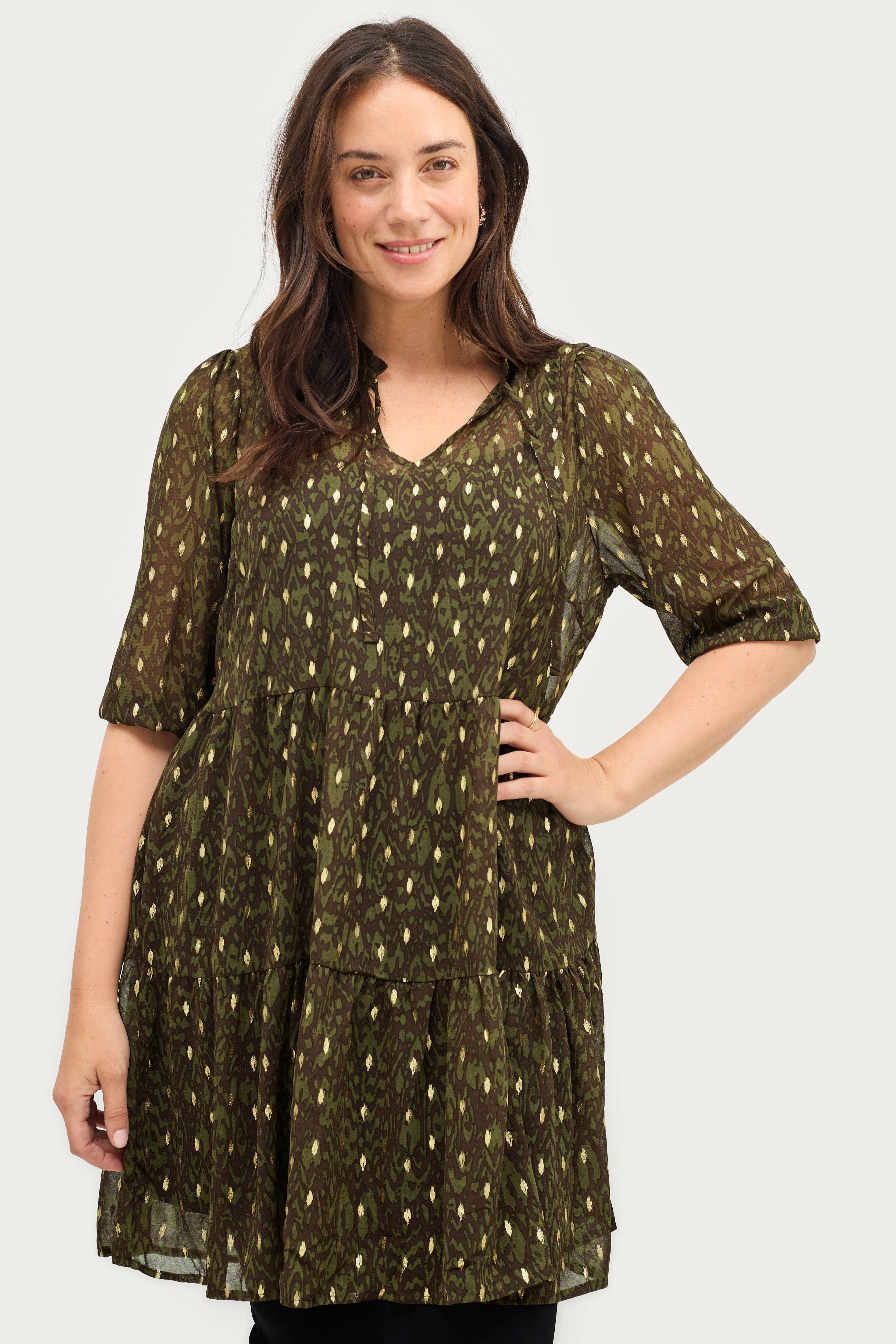• Plusstorlekar• Utsvängd modell med volang nedtill• 3/4-långa ärmar med elastiska ärmslut• Sprund med knytband i halsen• Gjord av chiffong• Underklänning i trikå• Längd: 90 cm i storlek S