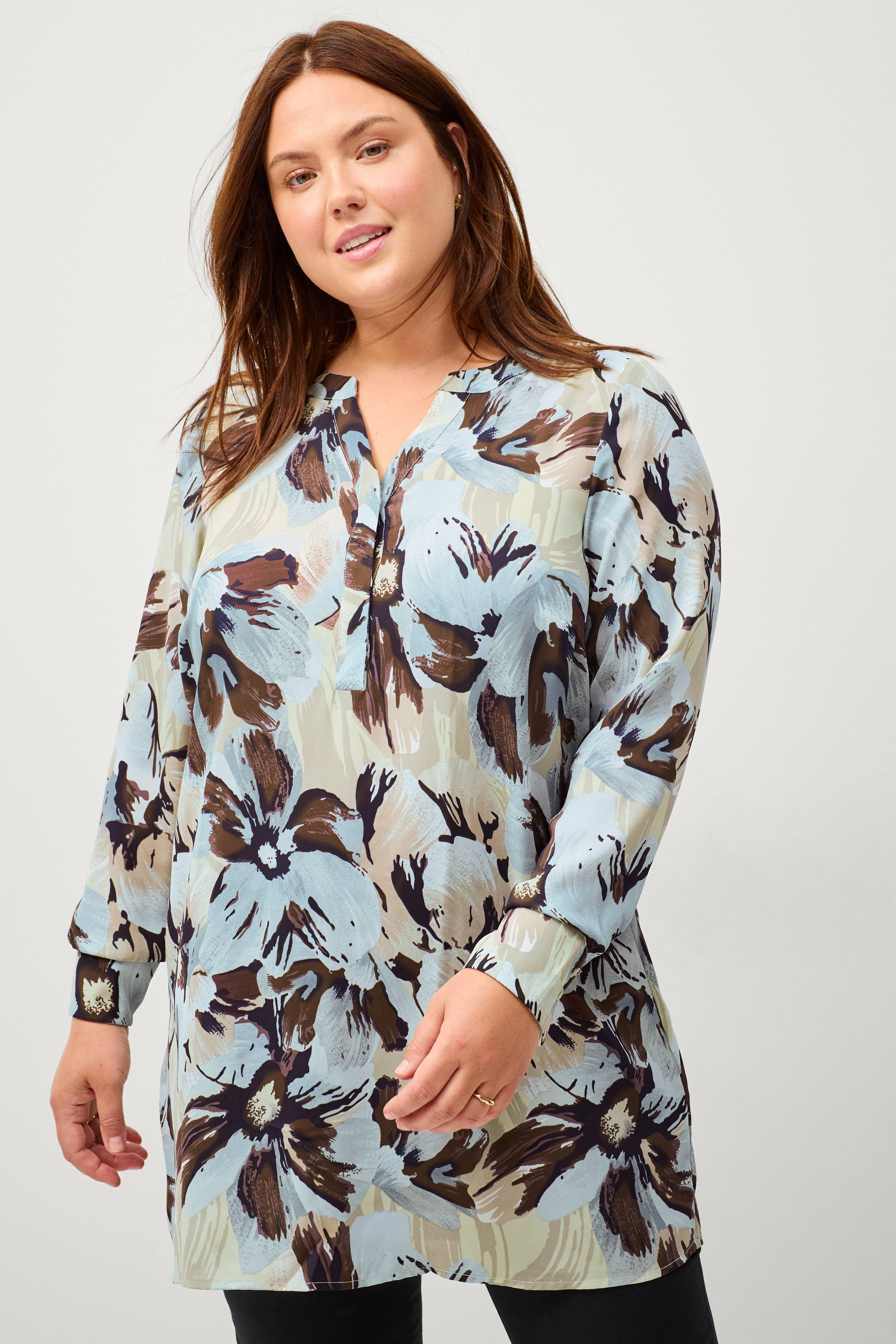 • Rak, normal passform• Tryckt mönster• V-ringning• Tre dolda knappar• Långa ärmar med tre knappar i ärmsluten• Plusstorlekar• Längd: 86 cm i storlek S