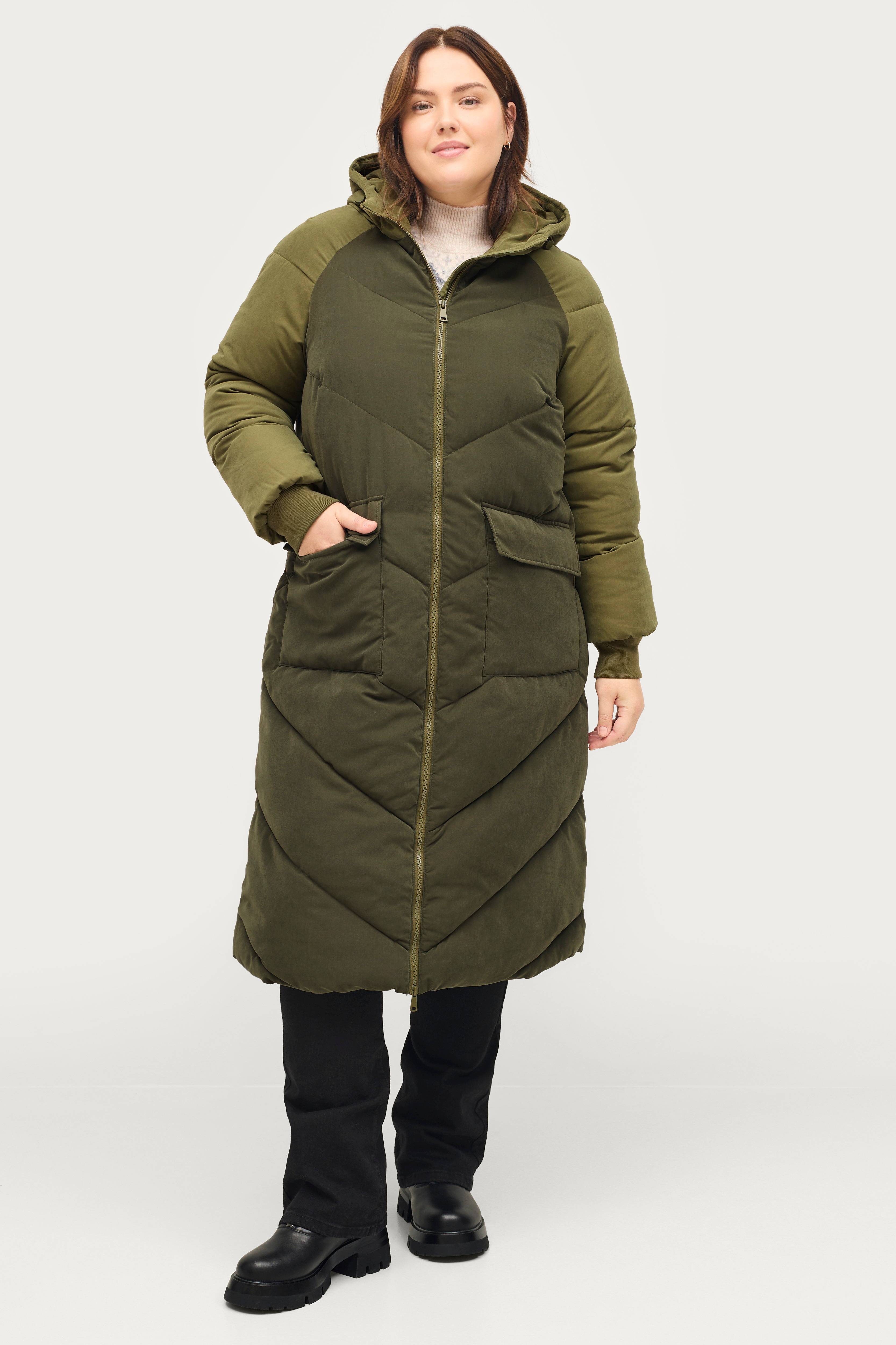• Lång, vadderad vinterjacka med matt yttertyg • Fast huva med dragsko • Tvåvägsdragkedja • Ribbmuddar i ärmsluten • Två fickor • Plusstorlekar • Längd: 118 cm i storlek S