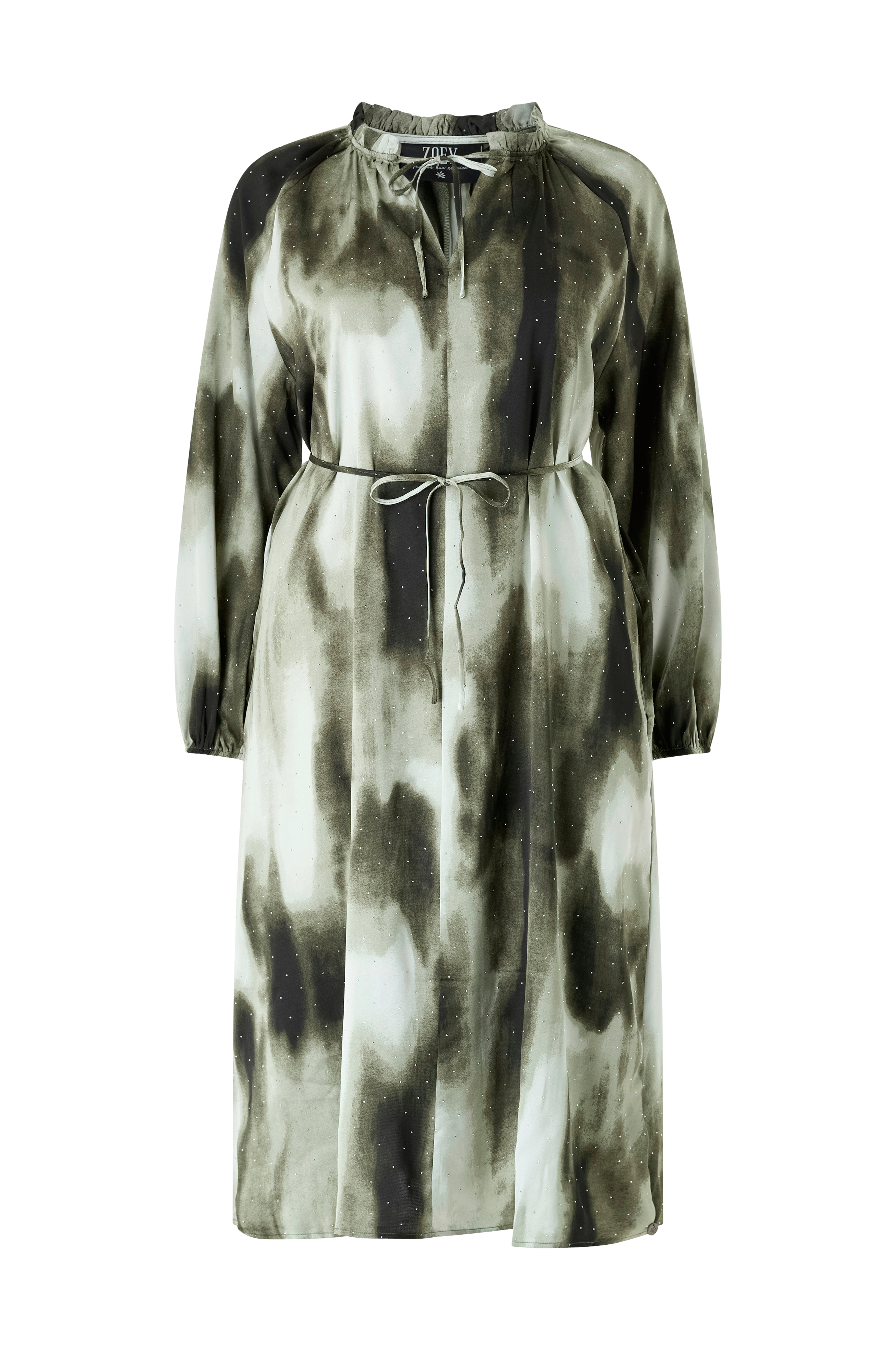 • Mönstrad klänning med glittrande, dekorativ strassten• V-ringad hals med volangkant med ett knytband upptill• Ballongärmar med resår i ärmsluten• Sidfickor• Avslappnad passform• Längd: 118 cm i storlek S• Plusstorlekar