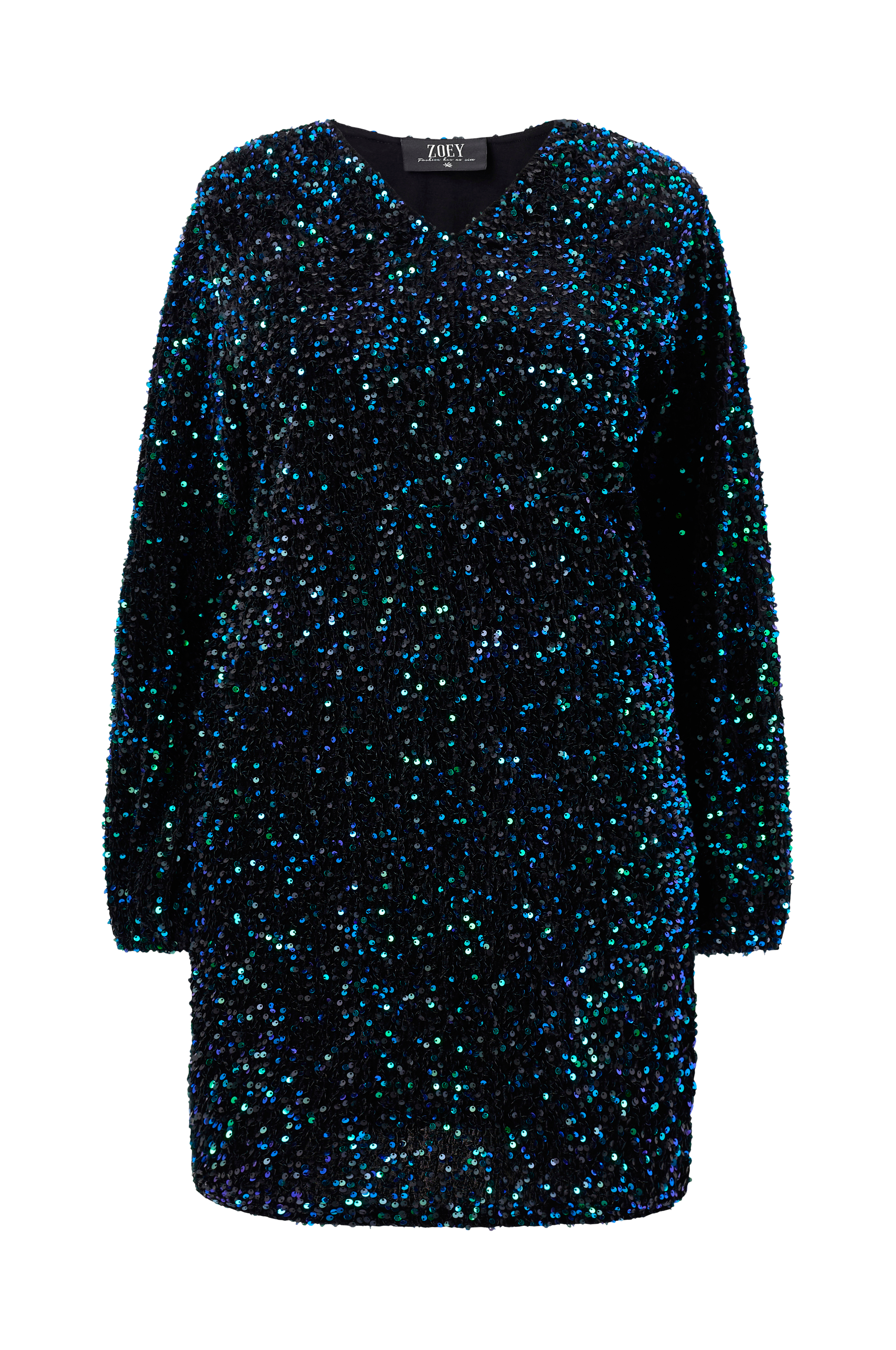 • Skimrande klänning med paljetter• V-ringad hals• Långa ärmar med resår i ärmsluten• A-linjeformad modell• Trikåfoder• Längd: 96 cm i storlek M• Plusstorlekar